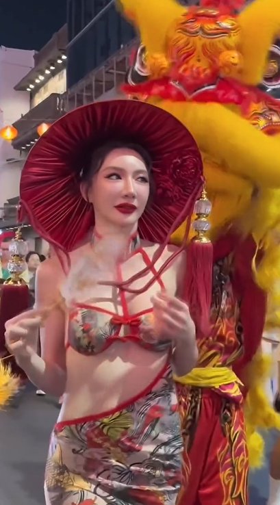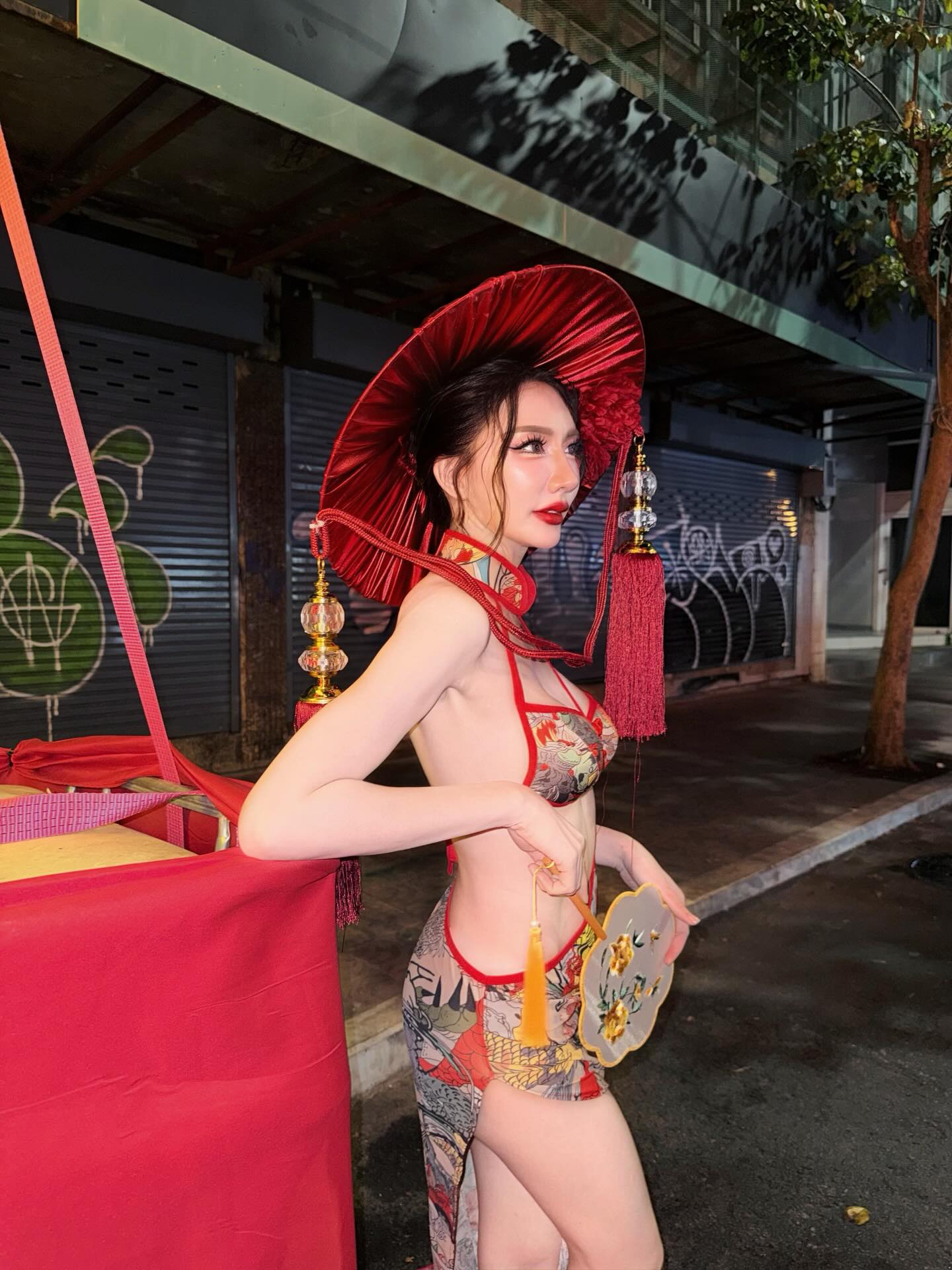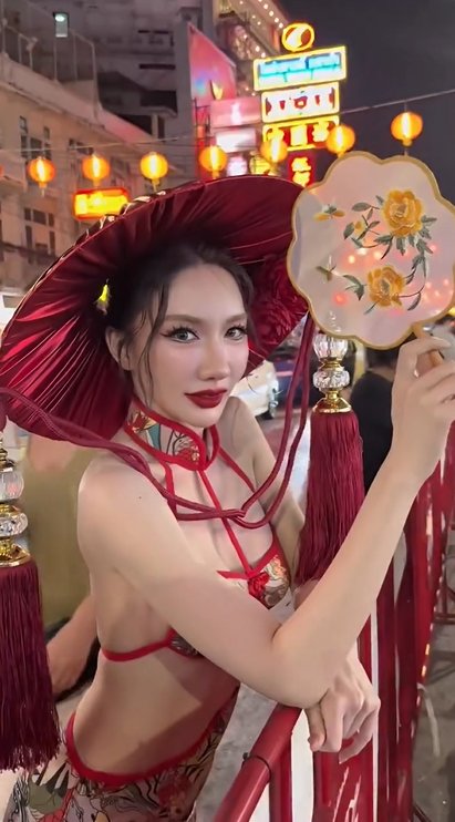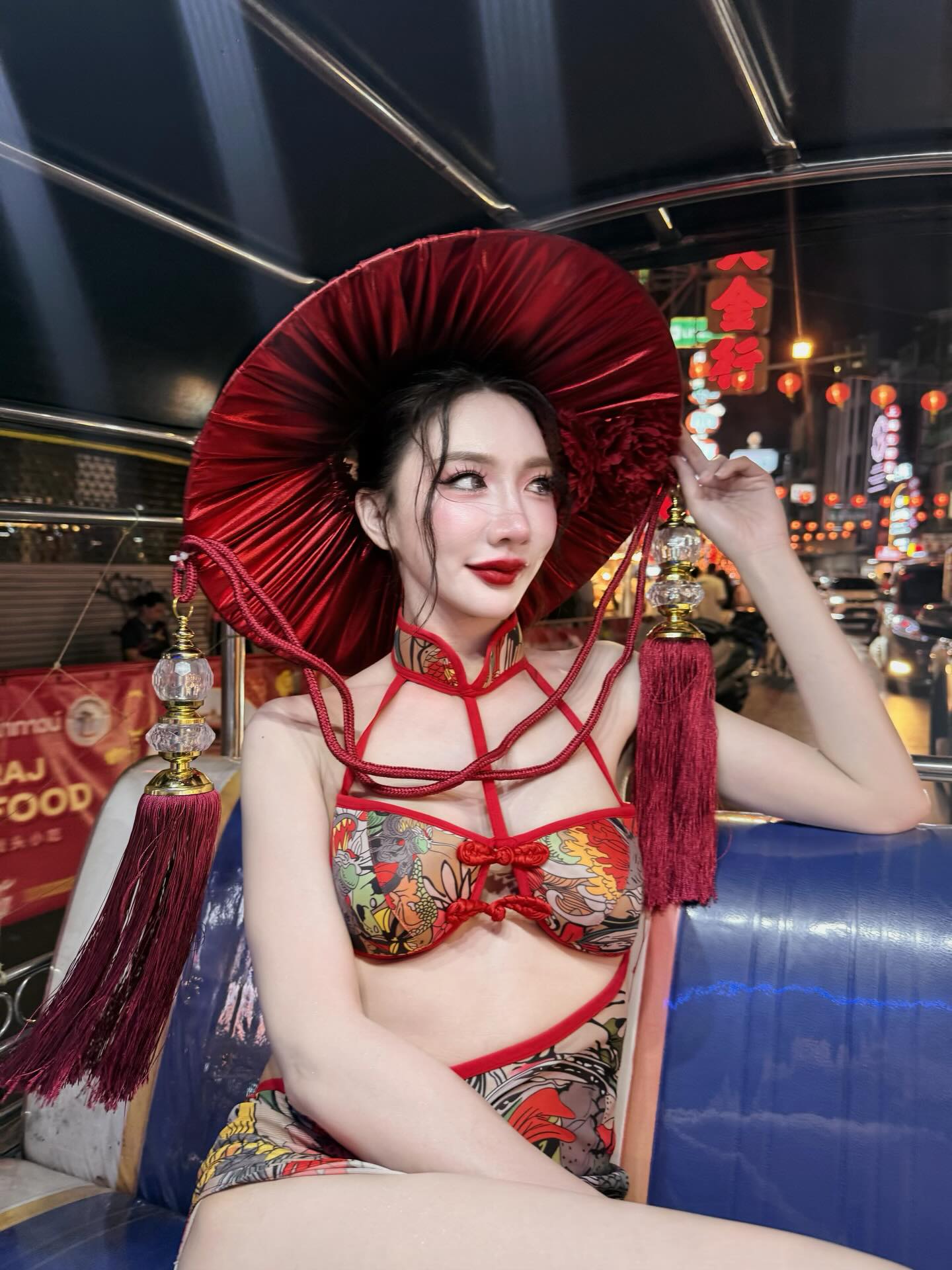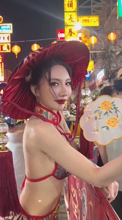 ชุดที่เธอเลือกสวมใส่เป็นชุดคล้องคอสีแดงสด ตัดกับผิวขาวเนียนอย่างชัดเจน เพิ่มลูกเล่นด้วยดีไซน์แหวกเว้าโชว์สัดส่วนสุดเซ็กซี่ พร้อมพร็อพจัดเต็มทั้งหมวกทรงจีนและพัดโบราณ ทำให้ภาพที่ออกมาดูสวยสะดุดตาและมีเสน่ห์แบบตะโกน