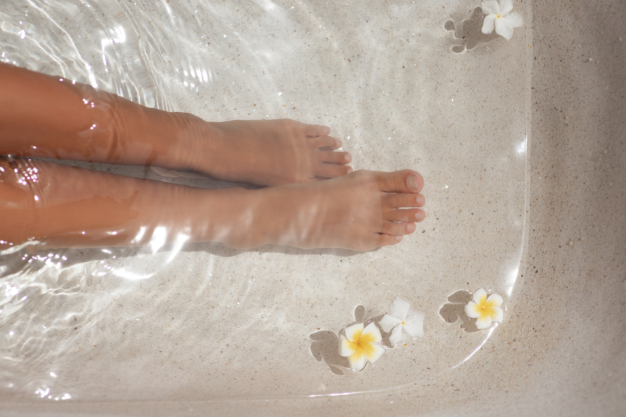 - หย่อนเท้าลงแช่ในน้ำร้อน