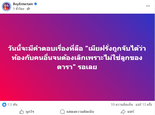 "พี่บอย เอ็นเตอร์เทน" เตรียมทิ้งบอมบ์ชุดใหญ่ ล่าสุดวันนี้ (18 มี.ค.) ความเข้มข้นพุ่งสูงขึ้นอีกระดับ เมื่อเจ้าพ่อสื่อบันเทิงอย่าง "พี่บอย เอ็นเตอร์เทน" ได้ออกมาเคลื่อนไหวผ่านโซเชียลส่วนตัว ระบุข้อความสั้นๆ แต่สั่นสะเทือนว่า "วันนี้จะมีคำตอบเรื่องที่ลือ เมียฝรั่งถูกจับได้ว่าท้องกับคนอื่นจนต้องเลิก เพราะไม่ใช่ลูกของดารา รอเลย"