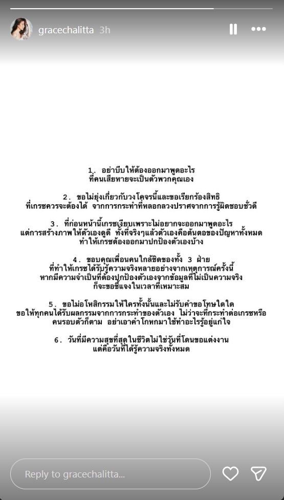 หลังจากที่ฝ่ายชายออกมาโพสต์ขอโทษและระบุว่าเป็นคนยุติความสัมพันธ์เองเนื่องจากปัญหาส่วนตัว ทางด้านเกรซก็ได้ออกมาตอกกลับด้วยเนื้อหาที่ทำเอาชาวเน็ตถึงกับตาสว่าง ดังนี้:
