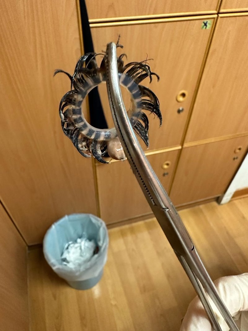 เมื่อพิจารณาวัตถุดังกล่าว พบว่ามีลักษณะเป็นวงกลม และมีเส้นขนสีดำโดยรอบ ดูคล้ายขนตาปลอมสำหรับแต่งหน้า ทำให้แพทย์เองก็รู้สึกประหลาดใจและไม่สามารถระบุได้ทันทีว่าคืออะไร