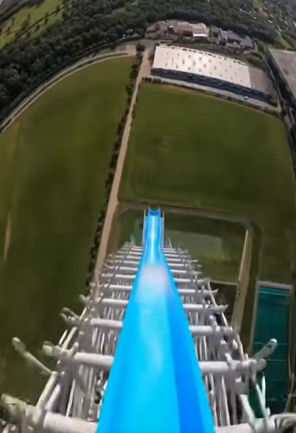 ในคลิปเริ่มต้นด้วยภาพมุมสูงจากยอดสไลเดอร์ขนาดใหญ่ ผู้เล่นกำลังจะไหลลงมาตามรางสีน้ำเงินที่ทอดยาวลงไปด้านล่าง ท่ามกลางวิวพื้นที่สีเขียวกว้างและสิ่งปลูกสร้างที่ดูเล็กลงอย่างเห็นได้ชัด