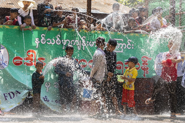 ชาวเมียนมาเรียกเทศกาลน้ำว่า "ทิงจัน" (Thingyan) เป็นเทศกาลที่ยิ่งใหญ่ที่สุดในรอบปี มีการจัดซุ้มไม้ไผ่ริมถนนเพื่อฉีดน้ำใส่ผู้คนที่ผ่านไปมา