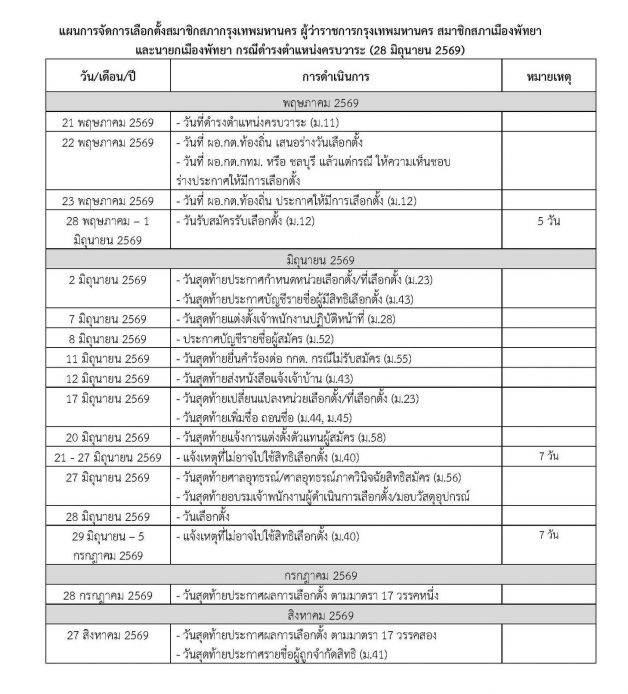 สำนักงานคณะกรรมการการเลือกตั้ง (กกต.) มีมติเห็นชอบแผนการจัดการเลือกตั้งท้องถิ่นครั้งสำคัญ โดยกำหนดให้มีการเลือกตั้งสมาชิกสภากรุงเทพมหานคร (สก.), ผู้ว่าราชการกรุงเทพมหานคร, สมาชิกสภาเมืองพัทยา และนายกเมืองพัทยา พร้อมกันในวันอาทิตย์ที่ 28 มิถุนายน 2569 เนื่องจากผู้ดำรงตำแหน่งชุดปัจจุบันจะดำรงตำแหน่งครบวาระตามกฎหมาย