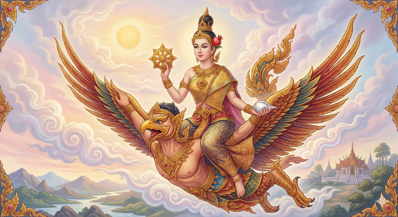 - พาหนะ: เสด็จมาบนหลังพญาครุฑ