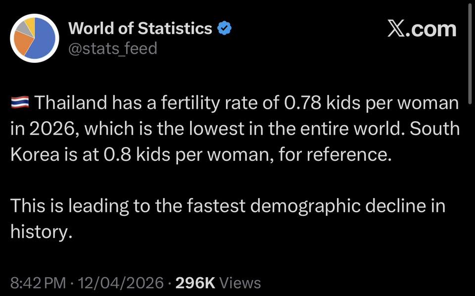 กลายเป็นประเด็นร้อนในโลกออนไลน์ เมื่อบัญชีชื่อดังอย่าง World of Statistics บนแพลตฟอร์มเอ็กซ์ โพสต์ข้อมูลเมื่อวันที่ 12 เมษายน 2026 ระบุว่า ประเทศไทยมีอัตราเจริญพันธุ์เพียง 0.78 ในปี 2026 ซึ่งถือว่าต่ำที่สุดในโลก แซงหน้าเกาหลีใต้ที่อยู่ที่ 0.8 พร้อมชี้ว่าสถานการณ์ดังกล่าวอาจนำไปสู่การลดลงของประชากรที่รวดเร็วที่สุดในประวัติศาสตร์