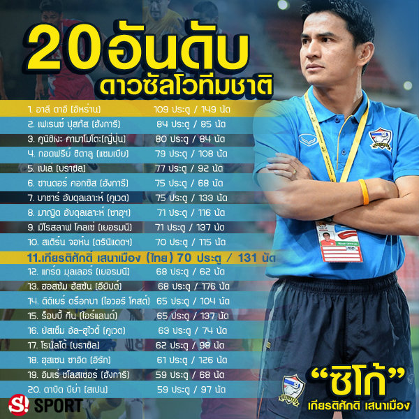 "Sportskeeda" สื่อชื่อดังอินเดีย เผยสถิติดาวซัลโวสูงสุดในนามทีมชาติ 20 อันดับแรก ปรากฎว่ามีชื่อของ "ซิโก้" เกียรติศักดิ์ เสนาเมือง อดีตศูนย์หน้าจอมตีลังกาของทีมชาติไทยติดโผอยู่ด้วย