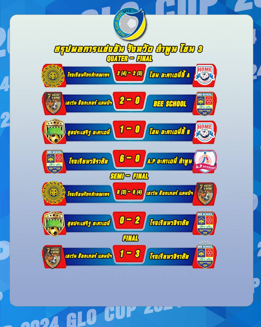 ขณะที่ผลการแข่งขันรายการ GLO CUP 2024 โซน 3 รอบจังหวัด ณ จังหวัดลำพูน วันที่ 4 เมษายน 2567