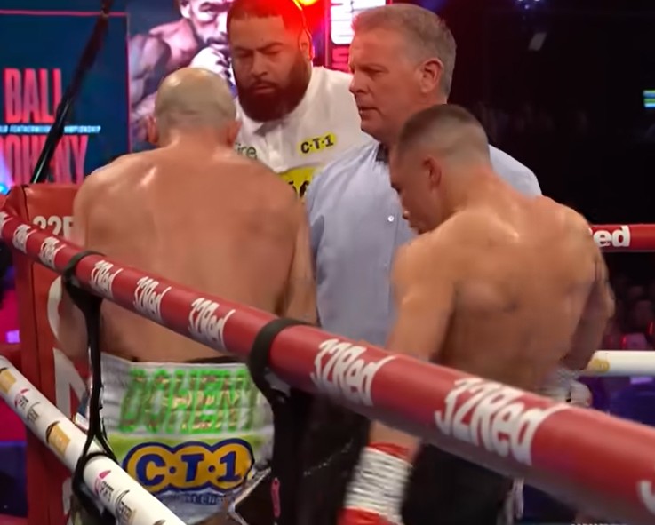 โดยมีจังหวะดราม่าเกิดขึ้นหลังจบยกแรกเมื่อ กำปั้นทั้งคู่มีปัญหากันที่มุมเวทีหลังจากที่ ทีเจ โดเฮนี ล็อกคอของกำปั้นชาวอังกฤษ ก่อนที่ นิก บอลล์ จะตอบโต้ด้วยการเตะคืนท่ามกลางความตกใจของแฟนมวย และทีมงาน