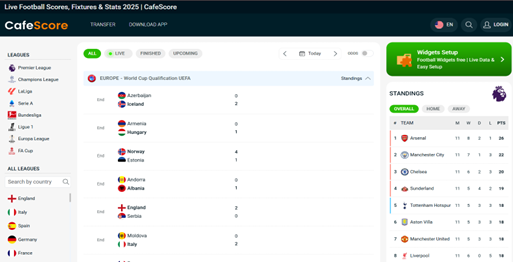 อินเทอร์เฟซหน้าแรกของ Cafescore - แพลตฟอร์มที่แฟนฟุตบอลสามารถเข้าถึงสถิติแบบเรียลไทม์ทั้งหมดได้