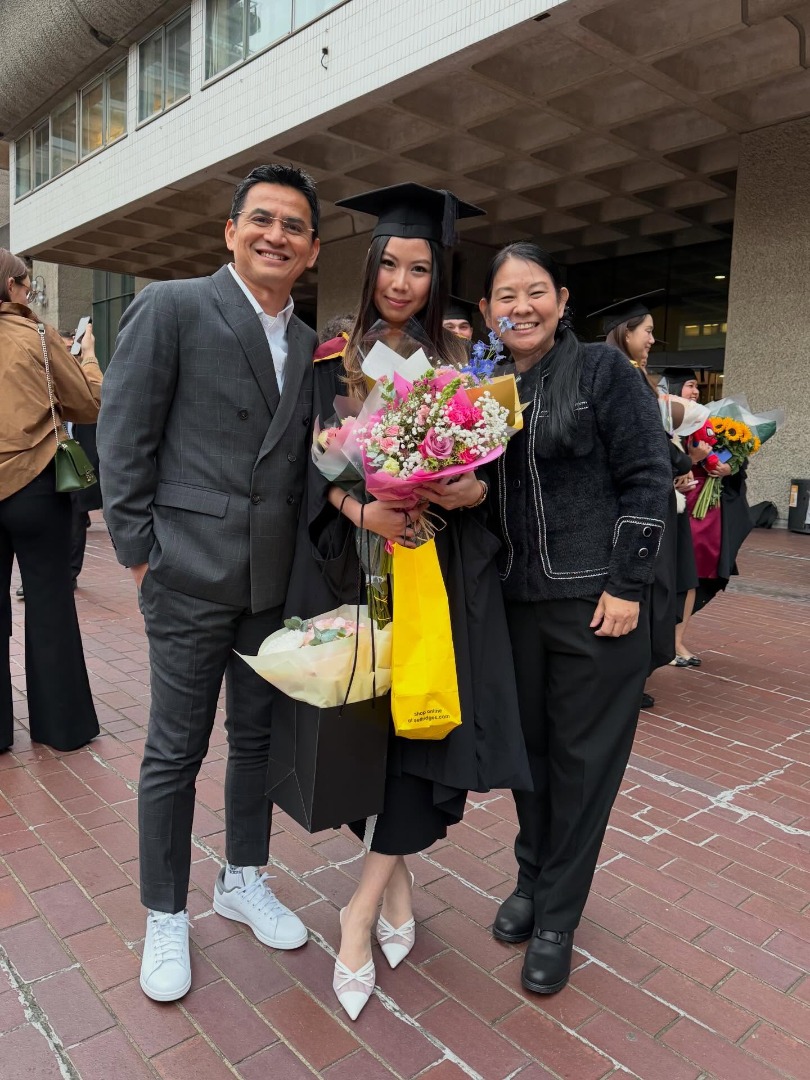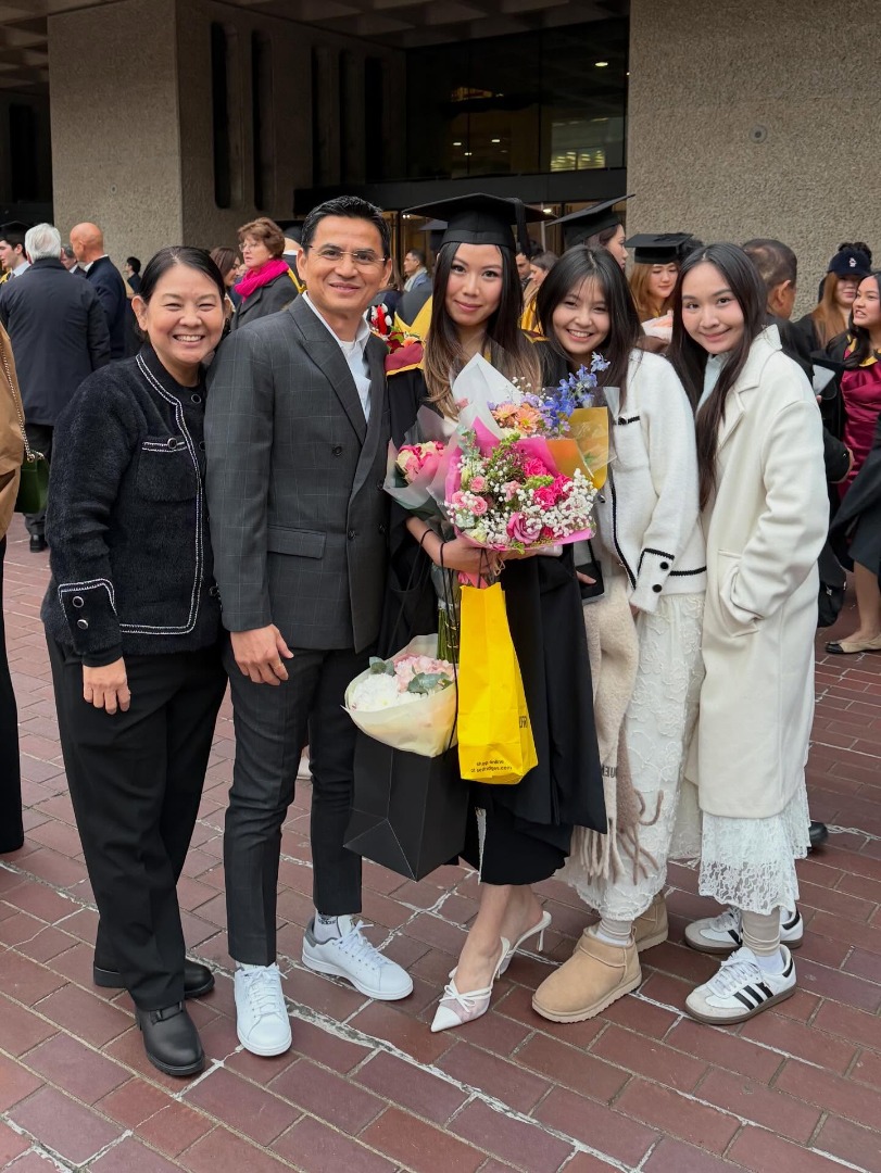 "ขอบใจลูกที่มุ่งมั่น อดทน เข้มแข็งตลอดระยะเวลา 7 ปีที่อยู่ที่อังกฤษ ไม่ง่ายเลยที่จะอยู่ที่นี่ การปรับตัว การใช้ชีวิตตั้งแต่แรกจนถึงปัจจุบัน พราวด์ทำได้ดี ขอบคุณทุกการกระทำ ประสบการณ์อันล้ำค่า จะอยู่กับพราวด์ไปตลอดชีวิต"