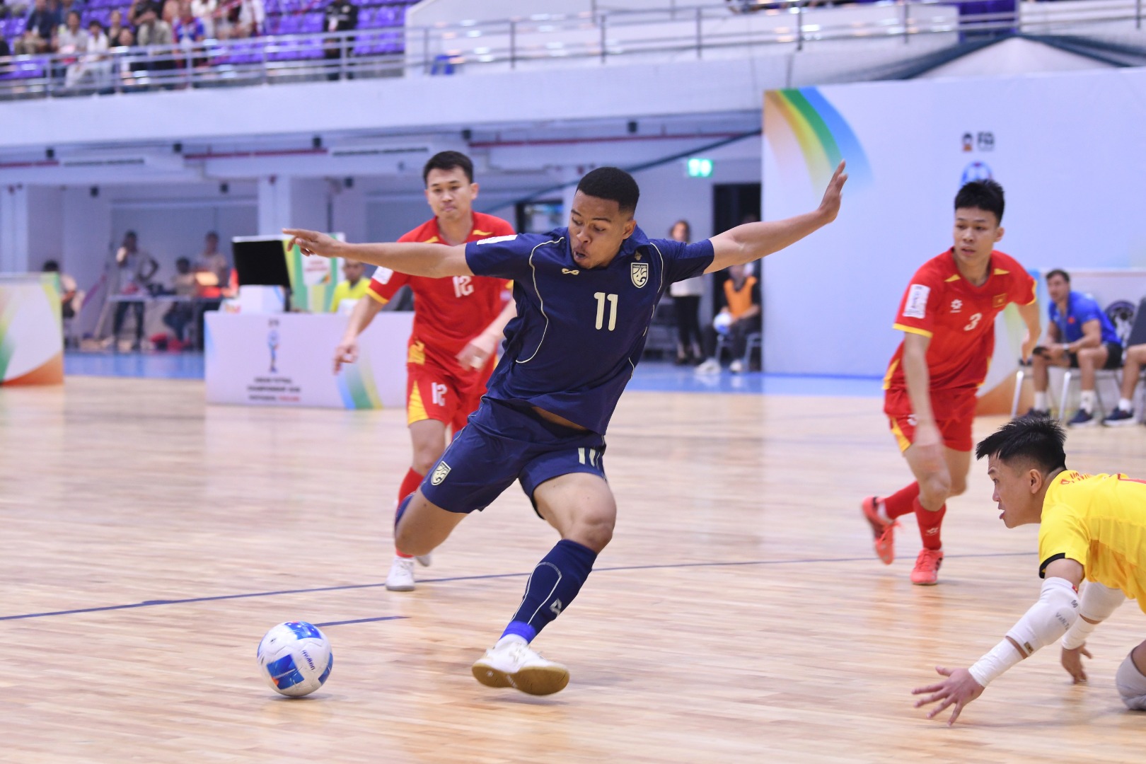 การแข่งขัน ฟุตซอล ชิงแชมป์อาเซียน 2026 กลุ่มเอ นัดที่สาม ทีมชาติไทย ลงสนามพบกับ เวียดนาม ทีมอันดับ 20 ของโลก ที่ยิมเนเซียม อบจ.นนทบุรี เมื่อวันที่ 8 เมษายน 2569