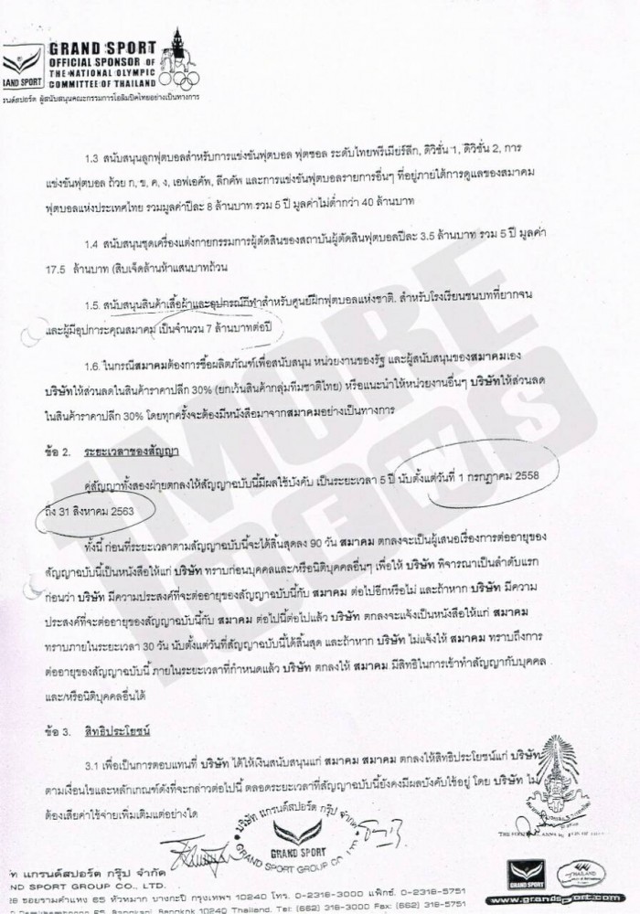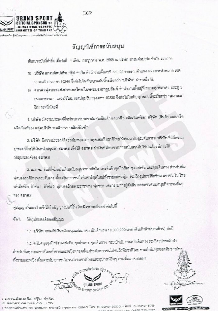 สัญญาให้การสนับสนุน สมาคมฟุตบอลแห่งประเทศไทย ในพระบรมราชูปถัมภ์ สมัยนายวรวีร์ มะกูดี เป็นนายกสมาคมฯ กับ บริษัท แกรนด์สปอร์ต กรุ๊ป จำกัด ที่จัดทำขึ้นในวันที่ 1 กรกฏาคม พ.ศ.2558