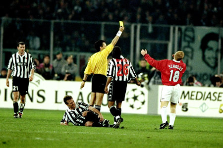 หลังจากพิชิตอินเตอร์ได้ในรอบก่อนรองชนะเลิศแชมเปี้ยนส์ลีกปี 1999 แมนฯ ยูไนเต็ดก็ต้องโคจรไปพบกับยูเวนตุสในรอบตัดเชือก ซึ่งสโคลส์และรอย คีน คู่หูในแดนกลางของเขา โชว์ผลงานได้อย่างยอดเยี่ยม โดยเฉพาะในเกมที่สองที่ผีแดงตามหลังม้าลายอยู่ถึง 2 ประตูตั้งแต่ต้นเกม แต่ก็แซงกลับมาชนะได้ 3-2 แต่เช่นเดียวกับคีน เมื่อสโคลส์รับใบเหลืองไปในเกมนี้ด้วย และเป็นใบเหลืองที่ทำให้ทั้งคู่หมดสิทธิ์มีส่วนร่วมในนัดชิงชนะเลิศครั้งประวัติศาสตร์ของทีม