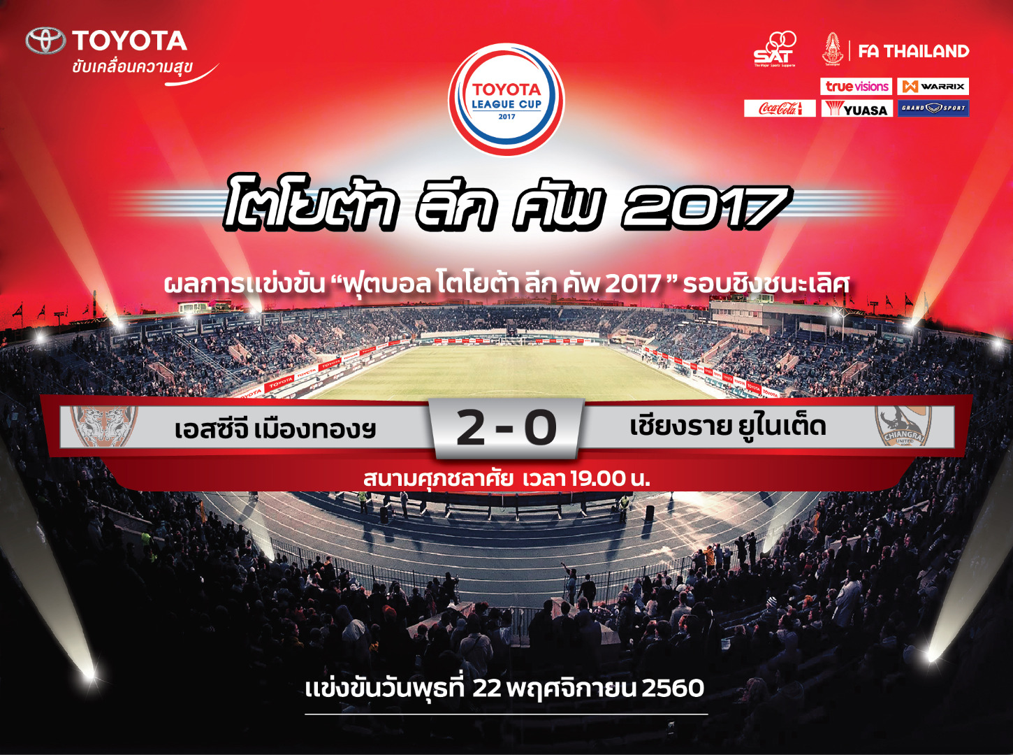 "บาส, มุ้ย" คนละตุง! "กิเลน" เชือด "กว่างโซ้ง" 2-0 ซิวแชมป์ลีกคัพ 2017การแข่งขันฟุตบอลโตโยต้า ลีกคัพ 2017 รอบชิงชนะเลิศ วันพุธที่ 22 พฤศจิกายน 2560 ที่สนามศุภชลาศัย เอสซีจี เมืองทอง ยูไนเต็ด พบกับ เชียงราย ยูไนเต็ด