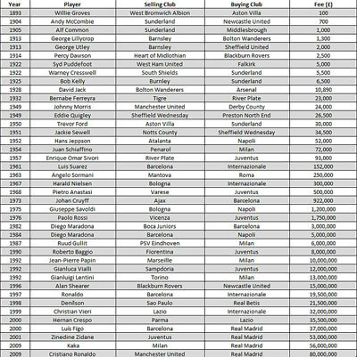 โลกลูกหนังทำลายสถิตินักเตะค่าตัวแพงสุดในโลกมาแล้ว 41 ครั้ง ตลอดช่วงระยะเวลา 120 ปีที่ผ่านมา รวมราคาทั้งสิ้น 411,964,490 ปอนด์ ไล่จากค่าตัวแค่ 100 ปอนด์ มาจนถึงคนล่าสุด 80 ล้านปอนด์