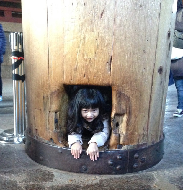 ทางด้านซ้ายของพระใหญ่ จะมีเสาต้นหนึ่ง ถูกเจาะรูอยู่ คนญี่ปุ่นเชื่อกันว่าหากผู้ใดเมื่ออธิษฐาน แล้วสามารถลอดเสาต้นนี้ได้ คำอธิษฐานนั้นจะเป็นจริง