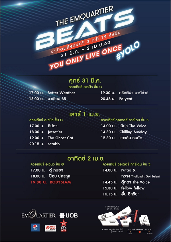 ดิ เอ็มควอเทียร์ บีทส์ 2017 ปีนี้งานมาด้วยคอนเซ็ปต์มันส์ๆ อย่าง You only live once และที่สำคัญคือเราก็จะไม่ได้ดูแค่บอดี้แสลมเพียงวงเดียว เพราะจัดเต็มด้วยศิลปินชั้นนำของประเทศอีกเยอะมาก ตัวอย่างเช่น คริสติน่า อากีล่าร์, ป็อป ปองกูล, ฮั่น อิสริยะ, แกงส้ม ธนทัต, ตู่ ภพธร, ลิปตา, Polycat, Jetset’er และศิลปินอื่นๆ อีกมากมาย (ไม่สามารถพูดให้ครบได้ เพราะเยอะมากจริงๆ)