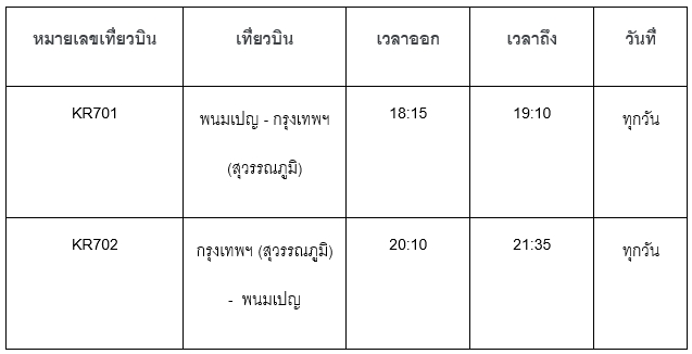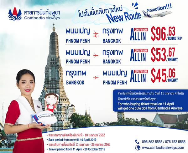 สายการบิน Cambodia Airways เตรียมเปิดเส้นทางบินพนมเปญ-กรุงเทพฯ ในวันที่ 11 เมษายนนี้สำหรับนักท่องเที่ยวที่ซื้อตั๋วเที่ยวบินแรกจะได้รับของขวัญเป็นที่ระลึกสุดพิเศษ โดยรับได้ที่เคาน์เตอร์จำหน่ายตั๋ว หรือตัวแทนจำหน่ายตั๋ว ราคาตั๋วเที่ยวบินแรกมาพร้อมกับโปรโมชั่นสุดคุ้ม เปิดจองตั๋วแล้วข้อมูลเที่ยวบินมีรายละเอียดดังนี้