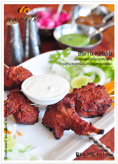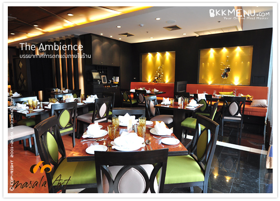 ที่ มาซาลา อาร์ท เสิร์ฟเมนูอาหารตำรับโบราณแท้ๆ ของอินเดียตอนเหนือ ซึ่งพิถีพิถันในการเลือกและใช้เครื่องเทศหลากหลายชนิดมาปรุงแต่งรสชาติโดยฝีมือของ เชฟ Anil เชฟชาวอินเดียผู้เชี่ยวชาญและมากประสบการณ์ในโรงแรมระดับ 5 ดาว บวกกับการใช้สูตรแบบโบราณผสมผสานกับปัจจุบันอันเป็นเอกลักษณ์ของร้านโดยเฉพาะ