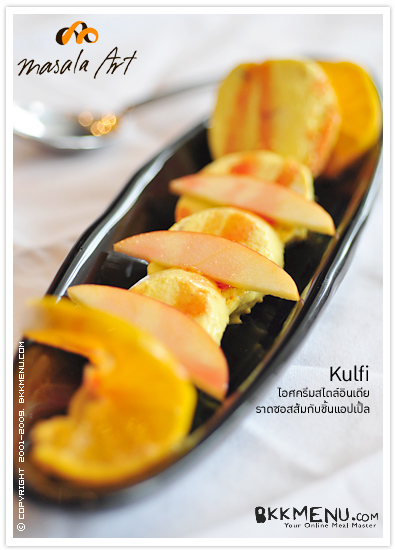 จากนั้นเป็นเมนู Main Course แนะนำ Murg Patiala (290 บาท) แกงไก่สไตล์ปัญจาป ชิ้นเนื้อไก่เคี่ยวจนเปื่อยนุ่มในน้ำแกงเข้มข้น โรยหน้าด้วยไข่เจียวหั่นเป็นเส้นยาว ทานคู่กับ Saffron Pulao (150 บาท) ข้าวอบหญ้าแซฟฟรอนสีเหลืองหอมกรุ่น อีกเมนูที่อยากให้ลอง Aloo Dum Kashmiri (190 บาท) แกงมันฝรั่งสอดไส้ถั่ว ในน้ำแกงมะเขือเทศ ขึ้นชื่อว่าเป็นอาหารอินเดียขาดไม่ได้เลยก็คือ เครื่องเคียงประเภทแป้งย่าง ประกอบด้วย Butter & Garlic Naan (60 บาท) นานเนยกระเทียม, Laccha Parantha (50 บาท) เป็นแป้งโรตีย่าง สุดท้ายเป็นของหวาน Kulfi (125 บาท) ไอศครีมสไตล์อินเดีย ราดซอสส้มกับชิ้นแอปเปิ้ล