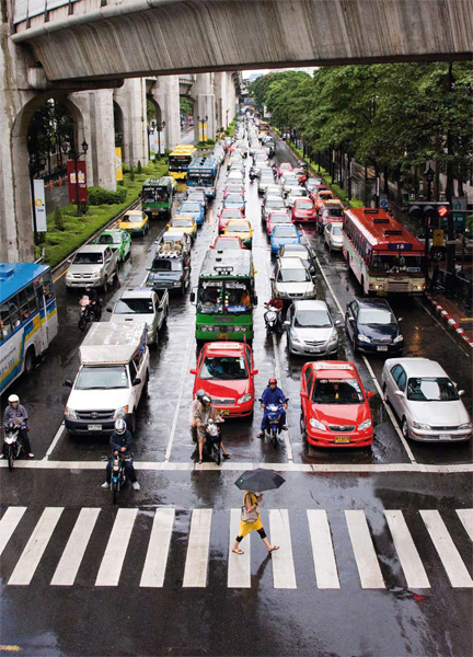 ภาพขวา "ผมถ่ายภาพนี้ที่กรุงเทพฯ เมื่อปีที่แล้ว การจราจรที่ติดขัดหยุดนิ่งน่าเบื่อยาวไปถึงข้างหลังทำให้คนคนหนึ่งในชุดสีเหลืองสดใสสามารถเดินข้ามถนนได้ สิ่งนี้มันช่างดูขัดแย้งกันมาก และฝนก็กำลังตกอยู่ด้วย! ผมถ่ายภาพนี้ไปเพียงภาพเดียวบริเวณตรงกลางของทางม้าลายที่ไม่มีโอกาสซ้ำสองอีกแล้ว นี่ถือเป็นช่วงเวลาที่จะได้หรือจะพลาดอย่างแท้จริง!"
