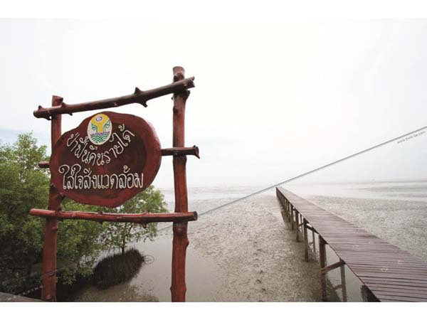 เราเดินชมธรรมชาติกันเรื่อยๆ บนสะพานไม้ที่ทอดยาว และขึ้นไปดู หอภูมิทัศนา ที่ทำให้เราเห็นว่า เรือนยอดของต้นโกงกางและต้นแสมได้เจริญเติบโต พร้อมทำหน้าที่ของมันได้แค่ไหนแล้ว สีเขียวของเรือนยอดต้นโกงกาง ตัดกับสีฟ้าอ่อนๆ ของท้องฟ้า ลมเย็นเบาๆ พัดผ่าน อยากให้ป่าชายเลนของบ้านเราในทุกๆ ที่ อุดมสมบูรณ์แบบนี้บ้าง ระหว่างที่เราเดินลองฟังดีๆ จะได้ยินเสียงเหมือนคนดีดนิ้วเป็นระยะๆ คุณอัญชลีบอกว่า นั่นคือ เสียงของกุ้งดีดขัน เวลาที่มันดีดตัวเพื่อเคลื่อนตัวเองอยู่บริเวณโคลนนั่นเอง คุณอัญชลีบอกเพิ่มเติม เมื่อเดินผ่านต้นแสมว่า หากมาในช่วงที่ดอกแสมบาน ที่แห่งนี้จะหอมกลิ่นดอกแสมมาก และแล้วเราก็เดินมาถึงปากทางของป่าชายเลน เจอเวิ้งทะเลโคลน ที่มีชาวบ้านลงไปเก็บหอยแครง ซึ่งจะได้ราคาดี และหอยตลับตัวอ้วน หาปูทะเล เพื่อนำไปขาย สร้างรายได้ให้กับครอบครัว