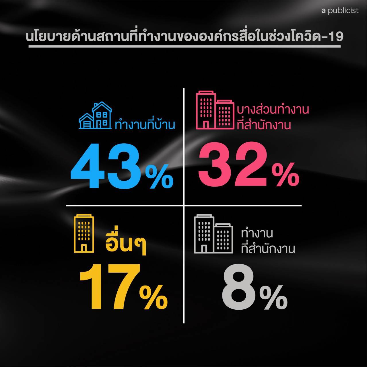 ส่วนนโยบายด้านสถานที่ทำงาน องค์กรสื่อส่วนใหญ่ หรือร้อยละ 43 ให้ความสำคัญกับการเว้นระยะทางสังคม โดยอนุญาตให้พนักงานหรือผู้สื่อข่าวทำงานแบบ Work-From-Home ในขณะที่บางองค์กร หรือร้อยละ 32 มีพนักงานบางส่วนคงทำงานที่สำนักงาน และมีเพียงร้อยละ 8 ที่ให้พนักงานทุกคนทำงานที่สำนักงานตามปกติ และส่วนสื่อมวลชนร้อยละ 17 มีการเข้าสำนักงานตามหน้าที่ที่ได้รับมอบหมาย หรือตามความสะดวกของพนักงาน