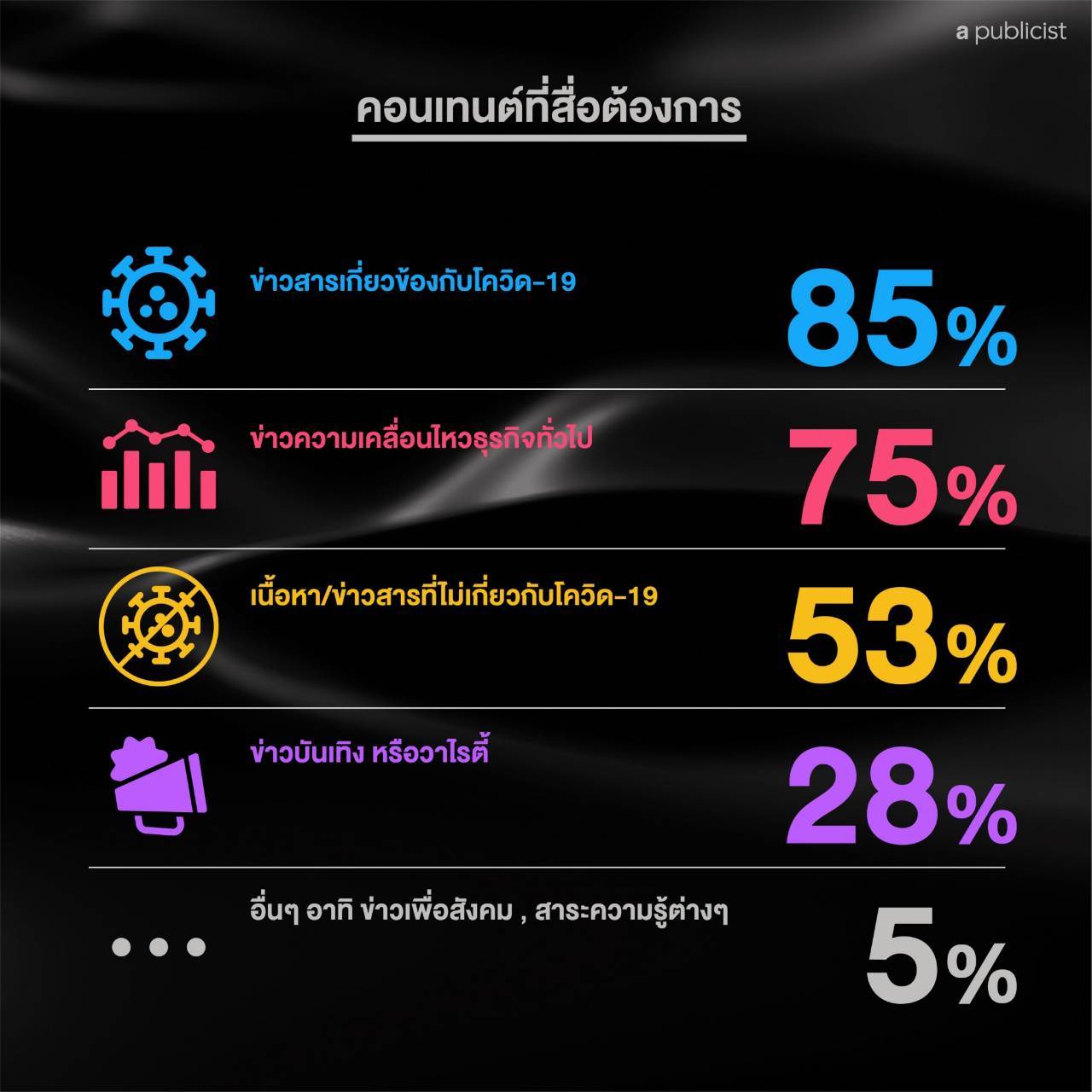 นับตั้งแต่ช่วงวิกฤตโควิด-19 สื่อมวลชนกว่าร้อยละ 43 ยอมรับว่าได้รับชิ้นข่าวประชาสัมพันธ์จากแบรนด์และพีอาร์น้อยลง ในขณะที่สื่อมวลชนหรือฝ่ายผลิตคอนเทนต์ก็มีความต้องการเนื้อหา ประเด็นข่าวเพื่อนำเสนอและเติมเต็มพื้นที่สื่อของตนเองในช่วงการแพร่ระบาดอย่างต่อเนื่อง โดยพบว่าร้อยละ 85 ต้องการเนื้อหาข่าวสารที่มีความเกี่ยวข้องกับโควิด-19 ตามมาด้วยต้องการข่าวความเคลื่อนไหวของธุรกิจทั่วไปร้อยละ 75 รวมถึงเนื้อหาข่าวสารที่ไม่เกี่ยวข้องกับโควิด-19 เลยร้อยละ 53 และอีกร้อยละ 28 ยังเป็นการต้องการข่าวบันเทิง หรือวาไรตี้