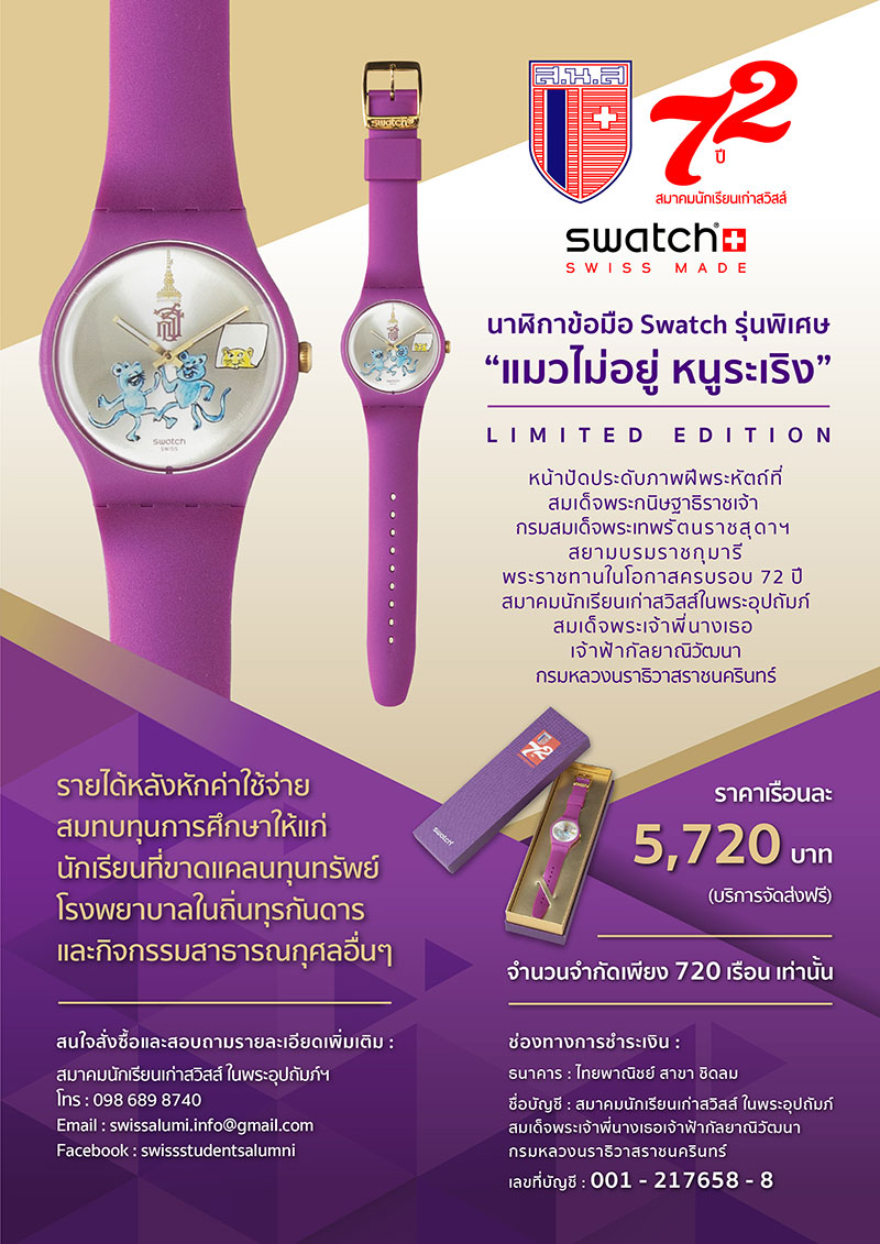 สมาคมนักเรียนเก่าสวิสส์ ในพระอุปถัมภ์ฯฉลองครบรอบ 72 ปี เปิดตัวนาฬิกาข้อมือสวอท์ช รุ่นพิเศษ “แมวไม่อยู่ หนูระเริง”