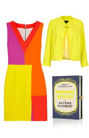 เริ่มด้วยเดรสคอวีแขนกุดสีสันสดใสแบบคัลเลอร์บล็อก (จาก Roksanda Ilincic) ที่จะเปลี่ยนคุณเป็นตนใหม่ที่สดใสร่าเริงและขี้เล่น ถ้าหนาวแขนก็คลุมด้วยเบลเซอร์สีเหลืองสด (จาก Topshop) เพิ่มกิมมิกให้คุณโดดเด่นอีกนิดด้วยคลัชรูปหนังสือสีน้ำเงิน (จาก Olympia Le-Tan)