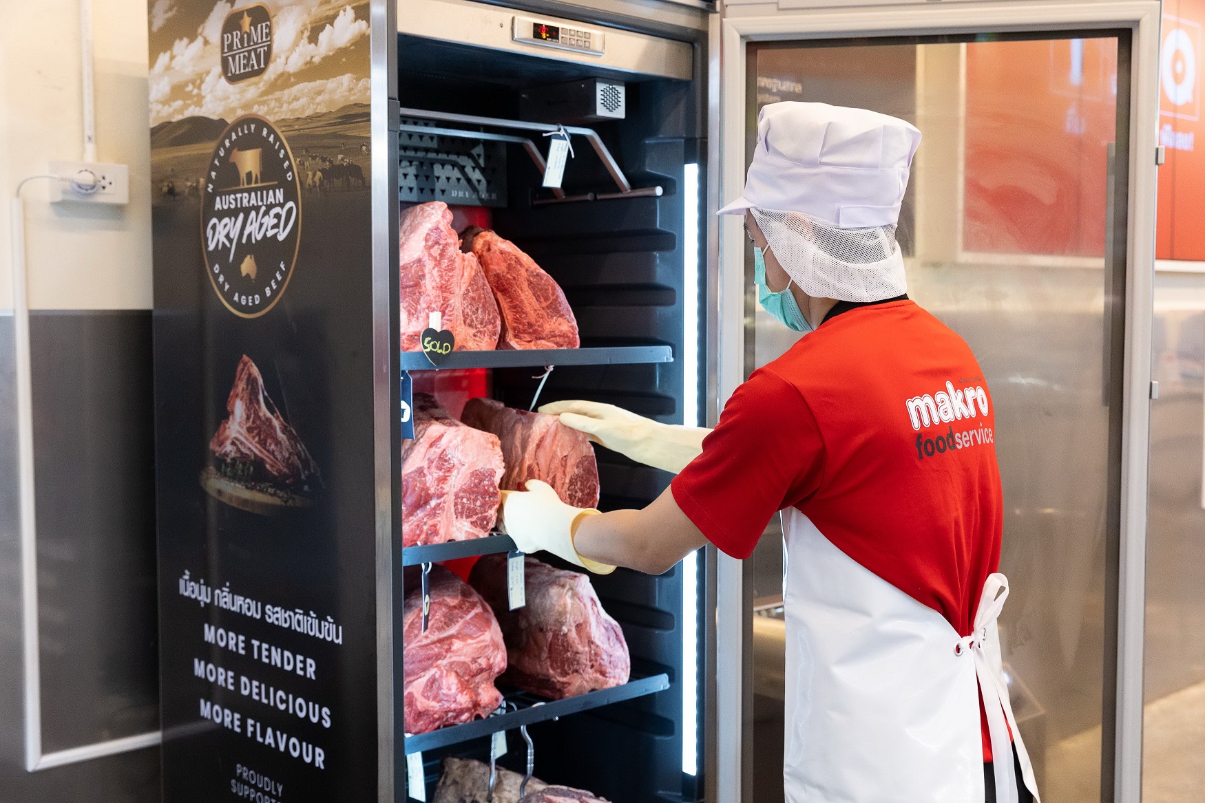 Australian Dry Aged Beef แบรนด์ Prime Meat เกิดจากเทรนด์การบริโภคเนื้อคุณภาพดีในเมืองไทยที่เติบโตขึ้นอย่างน่าสนใจ มีอัตราการเติบโตเฉลี่ย 15-20% ต่อปี โดยเฉพาะกลุ่มเนื้อบ่มแห้ง หรือ Dry Aged ซึ่งเริ่มเป็นที่รู้จักอย่างแพร่หลายและนิยมใช้เป็นวัตถุดิบหลักในการประกอบอาหารเพราะความพิเศษของรสชาติที่เข้มข้น มีความหอมนุ่มจากการบ่มด้วยการควบคุมอุณหภูมิ ความชื้นและความเร็วลมภายในห้องบ่มที่เหมาะสม ซึ่งการเปิดตัวครั้งนี้ แม็คโครได้นำ “ตู้บ่มแห้ง” มาติดตั้งภายในแม็คโคร ฟูดเซอร์วิส สาขาสุขุมวิท 22 เป็นแห่งแรก เพื่อสร้างประสบการณ์ใหม่ในการเลือกซื้อเนื้อ Dry Aged ที่สามารถมองเห็นกระบวนการบ่มแห้งภายในตู้บ่ม และเลือกเนื้อที่มีระยะเวลาการบ่มแตกต่างกัน ตั้งแต่ 21 วัน - 60 วัน และยังเลือกตัดขนาดได้ตามความต้องการ
