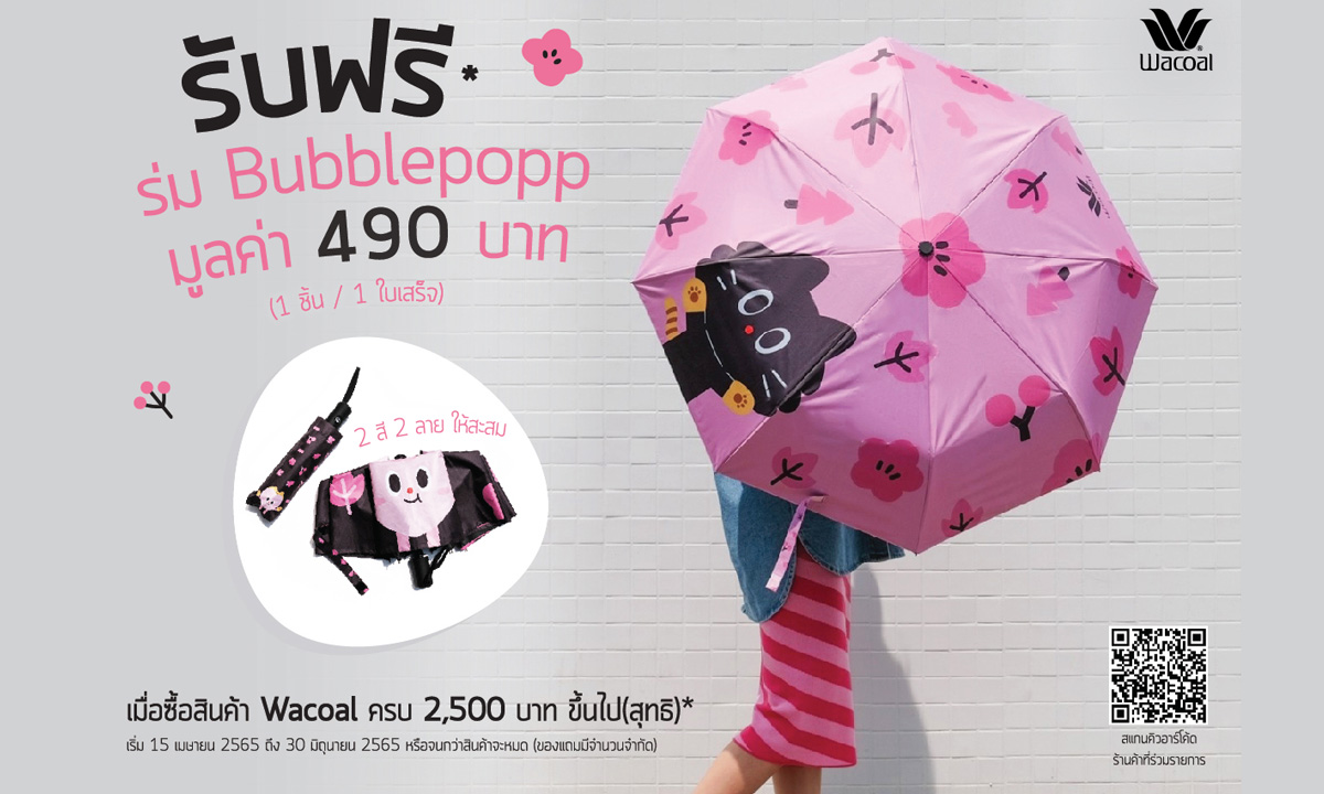 ปลายฤดูร้อนขยับสู่หน้าฝนที่ปนไปด้วยความน่ารัก กับโปรโมชันสุดพิเศษที่อยู่กับคุณทุกฤดู เพียงซื้อสินค้าวาโก้ 2,500 บาท (สุทธิ) ขึ้นไปต่อใบเสร็จ รับฟรีร่มสุดคิ้วท์ลิมิเต็ดอิดิชั่น ลายการ์ตูน Bubblepopp จำนวน 1 ชิ้น มูลค่า 490 บาท โดยมี 2 สี (สีชมพู, สีดำ) และ 2 ลวดลายให้เลือกสะสม (สงวนสิทธ์ 1 คนต่อ 1 สิทธิ์) ร่ม Bubblepopp สามารถป้องกันรังสียูวีจากแสงแดด กันฝนทนลมแรง พับเก็บง่ายพกพาสะดวก โปรโมชันแถมฟรีที่เลือกเฉพาะของพรีเมี่ยมดีๆ มีจำนวนจำกัด เริ่มวันที่ 15 เมษายน 2565 – 30 มิถุนายน 2565 (หรือจนกว่าสินค้าจะหมด) ณ วาโก้ช็อปและเคาน์เตอร์วาโก้ สาขาที่ร่วมรายการ *เงื่อนไขเป็นไปตามที่บริษัทฯ กำหนด ข้อมูลเพิ่มเติมที่ Call Center 02-296-9979