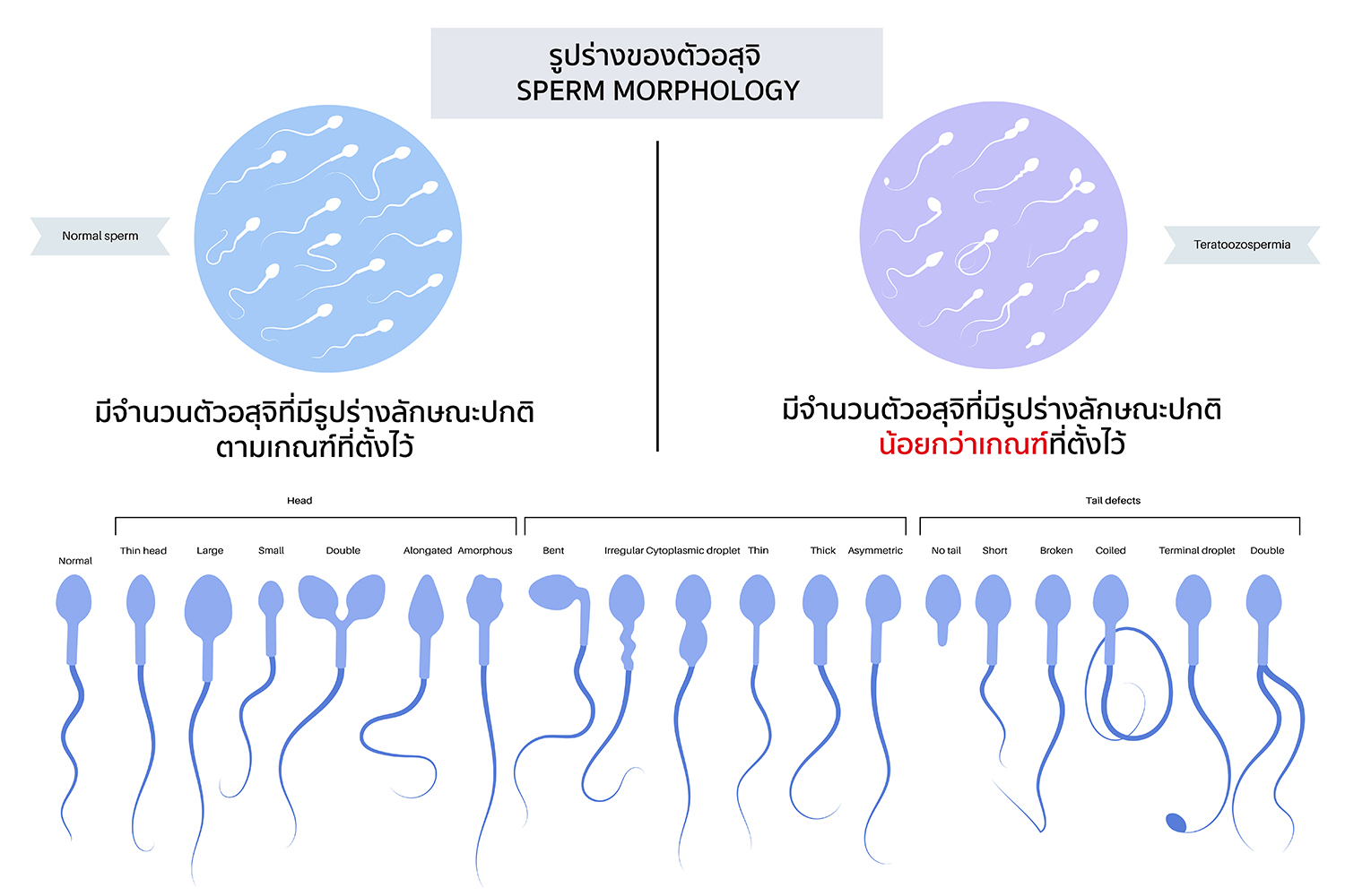 4. รูปร่างของสเปิร์ม (Morphology) ต้องมีรูปร่างสมบูรณ์ ปกติ ไม่น้อยกว่า 4%