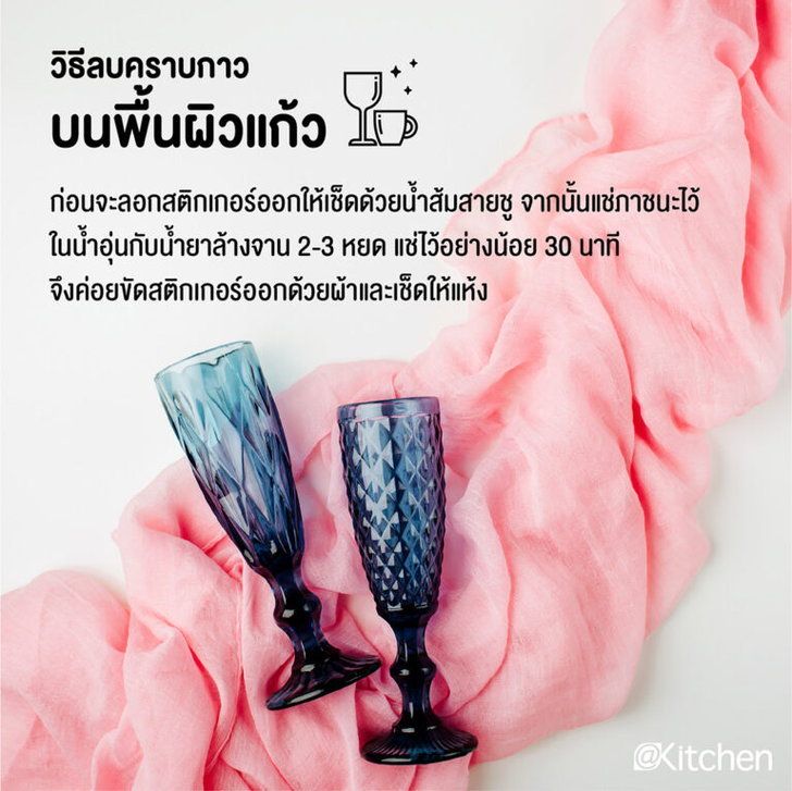 แน่นอนว่าการจัดการคราบกาวบนพื้นผิวเป็นรอยง่ายอย่างแก้วนั้นต้องอาศัยความใจเย็นอยู่พอควร เริ่มจากการเช็ดทำความสะอาดด้วยน้ำส้มสายชูแล้วจึงเช็ดให้แห้งด้วยผ้าสะอาด ก่อนจะลอกสติกเกอร์ออกให้ผสมน้ำอุ่นกับน้ำยาล้างจาน 2-3 หยด แช่แก้วหรือชามแก้วไว้อย่างน้อย 30 นาที แล้วใช้ผ้าสะอาดขัดสติกเกอร์ออก หากยังมีคราบกาวหลงเหลืออยู่ให้ทำขั้นตอนนี้ซ้ำอีกครั้ง เท่านี้ก็ได้แก้วและจานชามใสสะอาดน่าใช้งาน