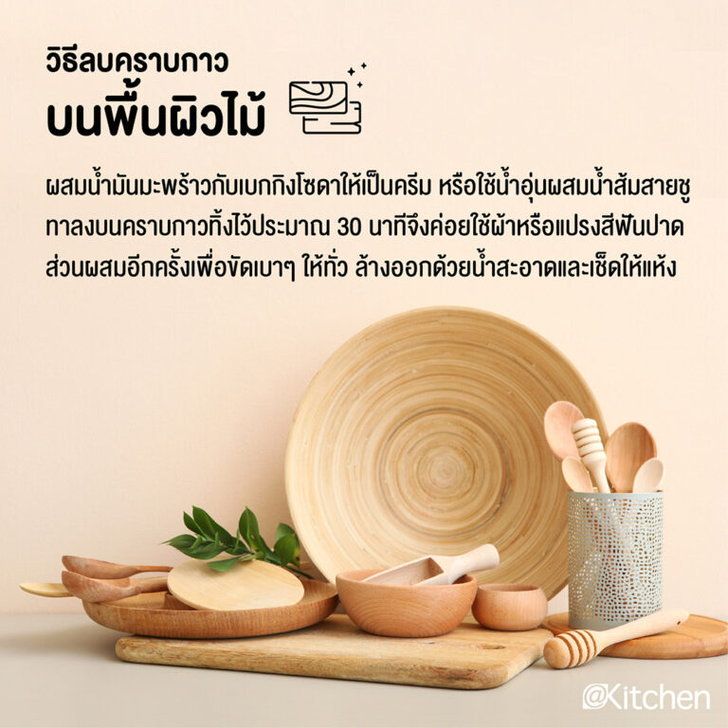 สำหรับใครที่ชอบสะสมเครื่องครัวไม้เป็นชีวิตจิตใจย่อมไม่ต้องการให้มีป้ายราคาแปะไว้บดบังความสวยของลายไม้ จัดการโดยผสมน้ำมันมะพร้าวกับเบกกิ้งโซดาแล้วคนจนมีความเป็นครีมประมาณหนึ่ง หรือหากไม่มีน้ำมันมะพร้าวก็สามารถทดแทนได้ด้วยการผสมในน้ำอุ่นและน้ำส้มสายชู ทาส่วนผสมนี้ลงบนบริเวณที่มีคราบกาวแล้วไว้ประมาณ 30 นาที ใช้ผ้าหรือแปรงสีฟันปาดส่วนผสมอีกครั้งเพื่อขัดเบาๆ ให้ทั่ว เมื่อแน่ใจว่าสติกเกอร์หลุดออกหมดแล้วจึงล้างออกด้วยน้ำสะอาดและเช็ดให้แห้ง สามารถขัดซ้ำอีกครั้งได้ด้วยผ้าชุบน้ำ