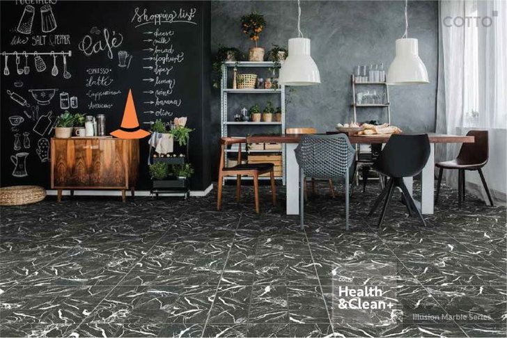 กระเบื้องลายอิลลูชั่นมาร์เบิ้ล ดำ (HYG) ได้ดึงเอาเสน่ห์ของหิน Marbre Le Jour et la Nuit หินอ่อนสีดำจากฝรั่งเศสที่มีความสวยของสายแร่เส้นริ้วสีขาวตัดกับสีดำสนิทของเนื้อหิน จึงถูกเรียกอีกชื่อหนึ่งว่า Day and Night Marble นำมาจัดวางในรูปแบบของหิน 9 ช่องให้อารมณ์เหมือนใช้โมเสกขนาด 4x4 นิ้ว ทำให้ลวดลายของหินดูมีเสน่ห์มากยิ่งขึ้น เหมาะกับห้องอาหารแบบชิค ชิค เลือกตกแต่งด้วยเฟอร์นิเจอร์ไม้ หรือเหล็ก ตลอดจนโคมไฟ และผ้าม่าน คุมด้วยโทนสีขาว เทา ดำ ช่วยทำให้ห้องดูเก๋ไก๋ชวนให้นั่งทานอาหารได้อย่างสนุกสนาน