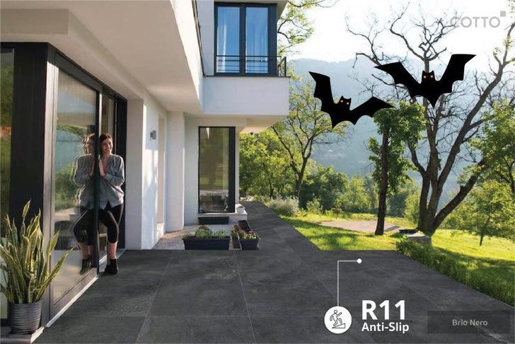 กระเบื้องลายบริโอ เนโร (HGY) R11 ได้ถูกดีไซน์จากการนำเสน่ห์ความหลากหลายของลวดลายในเนื้อหิน Quartzite หินธรรมชาติที่มีความสวยของเนื้อหินเป็นเอกลักษณ์เฉพาะตัว นำมาถ่ายทอดอย่างสมจริงเสมือนใช้หิน Quartzite ธรรมชาติในการแต่งบ้านจึงเหมาะกับการใช้ปูพื้นชานบ้านหรือลานรอบบ้านช่วยทำให้พื้นที่ดูกลมกลืนไปกับธรรมชาติรอบบ้านได้ลงอย่างลงตัว และเลือกใช้กระเบื้องโทนสีดำให้เข้ากับกรอบกระจกสีดำรอบบ้านทำให้ภาพรวมของบ้านดูเรียบและโดดเด่นแบบไม่ต้องตกแต่งอะไรเพิ่มเติม นอกจากนี้บริโอ เนโร ขนาด 30x60 cm. ยังเป็นกระเบื้องยับยั้งแบคทีเรีย(Hygienic Tile) พื้นผิวหน้ามีค่า R11 ที่ช่วยลดความเสี่ยงจากการลื่นล้ม (Anti–Slip) ในการทำกิจกรรมสันทนาการต่าง ๆ ของครอบครัวในกพื้นที่ลานรอบบ้านได้อย่างปลอดภัยจากการเปียกน้ำฝน หรือการรดน้ำต้นไม้ในสวน