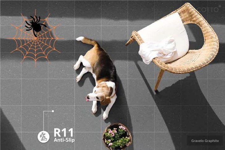 กระเบื้องลายกราเวลโล กราไฟต์ (HGY) R11 เป็นการนำเอาดีไซน์ยอดนิยมตลอดกาลของหิน Terrazzo ที่มีเสหน่ห์ของเม็ดหินอ่อนวางกระจายได้อย่างลงตัวดูสบายตาได้ความเป็นมินิมอล มีคุณสมบัติ Hygienic ที่จะช่วยป้องกันคนที่รักรวมถึงน้องหมาให้ปลอดภัยจากแบคทีเรียมีผิวสัมผัส R11 (Anti-Slip) พื้นหยาบทำให้น้องหมาวิ่งเล่นได้อย่างสนุกสนานไม่ลื่นล้ม และไม่เป็นรอยจากกรงเล็บของน้อง การเลือกใช้โทนสีดำก็ช่วยทำให้มองเห็นขนของน้องหมาได้ง่ายขึ้น สามารถเก็บกวาดได้สะอาดหมดจดมากขึ้นในทางกลับกันก็ช่วยอำพรางสิ่งสกปรกไว้ด้วย การเลือกสรรวัสดุที่ใช่จึงเป็นส่วนหนึ่งในการสร้างบ้านให้เป็นพื้นที่ปลอดภัยและพื้นที่แห่งคุณภาพชีวิตที่ดีของทุกคในครอบครัวรวมทั้งสัตว์เลี้ยงที่รัก
