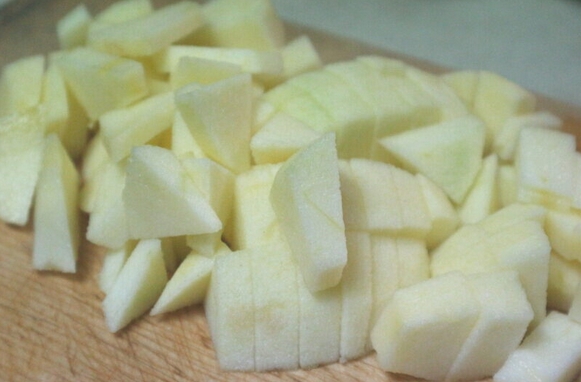 2. ปอกเปลือกแอปเปิ้ล หั่นเอาแกนกลางออก หั่นเป็น 6-8 ชิ้น จากนั้นหั่นแอปเปิ้ลให้มีขนาดประมาณ 1 เซนติเมตร