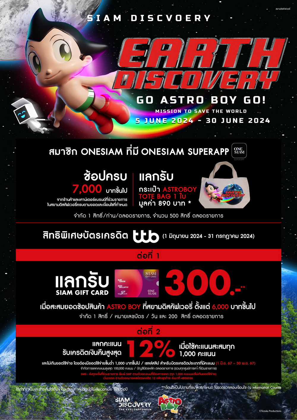 -โปรโมชั่น Earth Discovery: Go Astro Boy GO! สมาชิกวันสยามที่มี ONESIAM SUPERAPP ช้อปครบ 7,000 บาทขึ้นไป แลกรับกระเป๋า ASTRO BOY TOTE BAG 1 ใบ พิเศษ!! สำหรับผู้ถือบัตรเครดิต TTB ช้อประหว่างวันที่ 1 มิถุนายน 2567 – 31 กรกฎาคม 2567 แลกรับ Siam Gift Card 300 บาท เมื่อช้อปสินค้า Astro Boy ที่สยามดิสคัฟเวอรี่ตั้งแต่ 6,000 บาทขึ้นไป