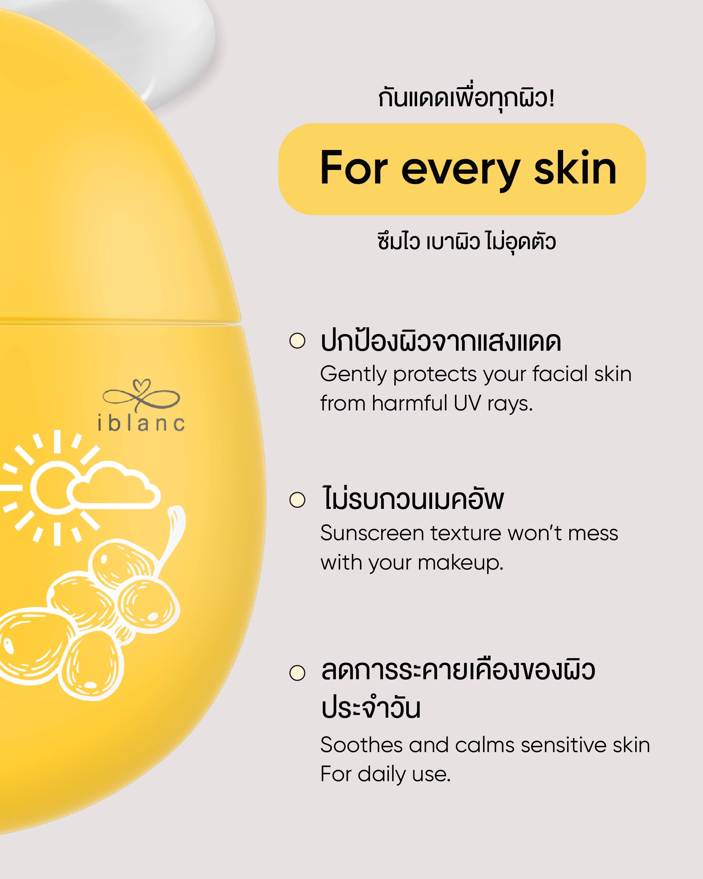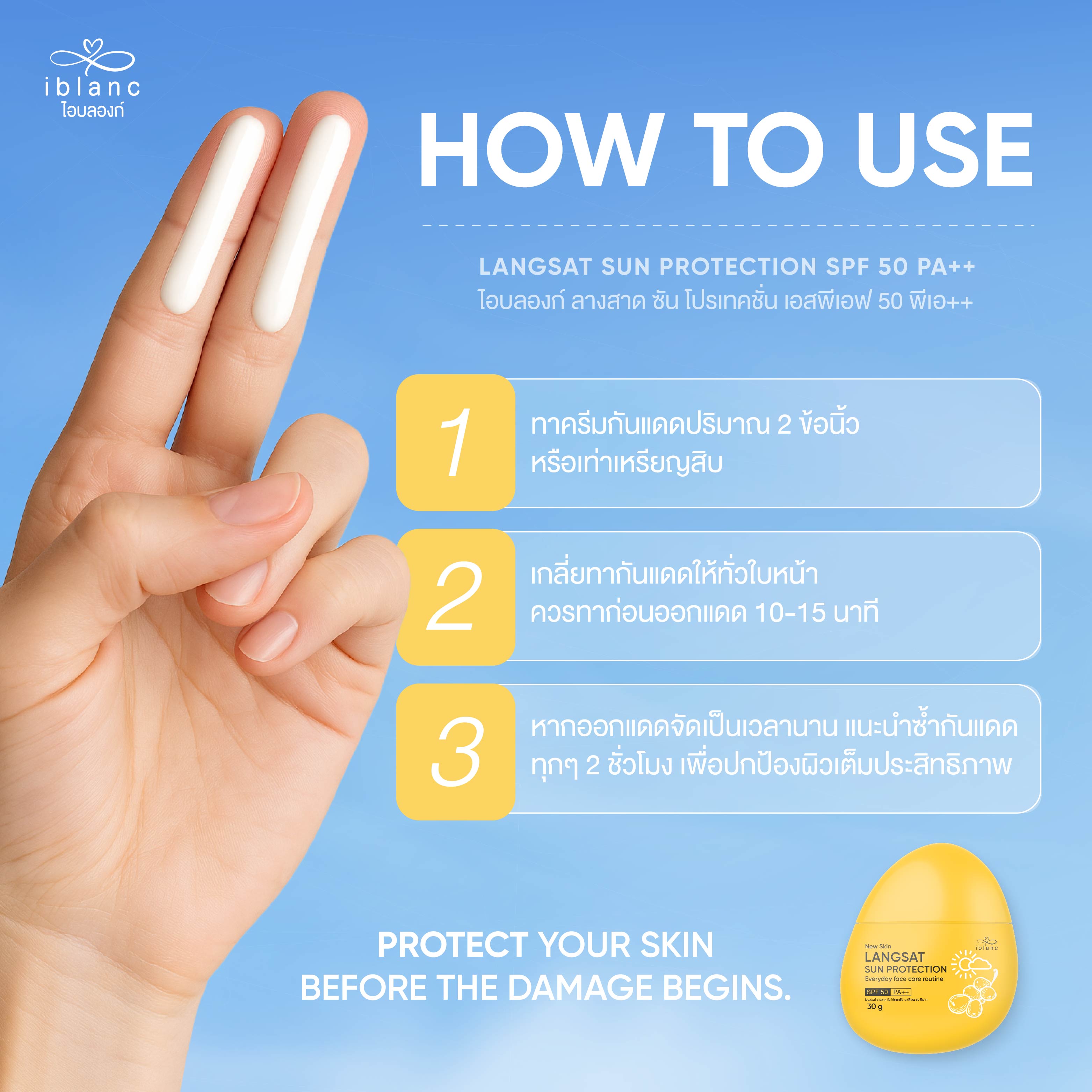 กันแดดยุคใหม่ ต้องไม่ใช่แค่ “กันแดดได้” แต่ต้อง บำรุงลึก ฟื้นฟูผิว และป้องกันผิวแก่ก่อนวัย ได้ไปพร้อมๆ กัน “iblanc Langsat Sun Protection SPF50 PA++” คือตัวอย่างของนวัตกรรมสกินแคร์ ที่รวม “Active ระดับเวชสำอาง” กับ “สารกันแดดนำเข้า photostable” ที่ผสมผสานเข้ากันได้อย่างลงตัว เป็นกันแดดที่คิดค้นมาเพื่อทุกสภาพผิว โดยเฉพาะคนเป็นสิวผิวแพ้ง่ายมาก เป็นกันแดดที่ช่วยเสริมเกราะป้องกันผิวให้แข็งแรงขึ้น ไม่แห้งลอก ช่วยให้ผิวทนแดดได้ดี และยังเหมาะกับผู้ที่ใช้ยาแต้มสิว หรือ กรดวิตามินเอได้อีกด้วย