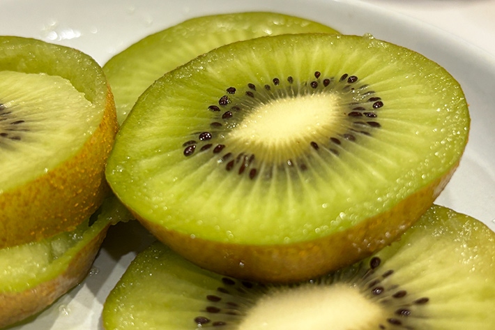 กีวี่ที่จัดการขนเรียบร้อยแล้ว สามารถกัดตรง ๆ ได้เลย หรือหั่นเป็นวงก็สะดวกและอร่อย