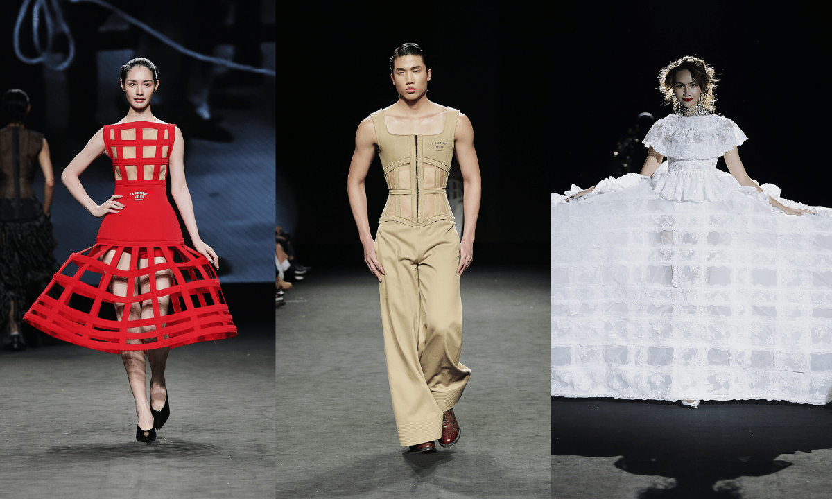ตามมาด้วยแบรนด์ LA BOUTIQUE กับคอลเล็กชั่น The Architectural Body Atelier 2026 ที่สะท้อนมุมมองใหม่ของ “ร่างกายมนุษย์ในฐานะสถาปัตยกรรม” ผ่านโครงสร้างเสื้อผ้าที่เปี่ยมด้วยความละเอียด ประณีต และจิตวิญญาณของงานฝีมือระดับสูง นำแรงบันดาลใจจาก ยุควิกตอเรียน (Victorian Era) ยุคแห่งความหรูหราที่แฟชั่นเล่นกับรูปร่างของร่างกายมนุษย์อย่างสุดขั้ว ทั้งเอวคอด กระโปรงสุ่ม และโครงสร้างเสื้อผ้าที่เต็มไปด้วยพลัง โดดเด่นด้วย Craftsmanship ที่ซับซ้อน และ การทดลองวัสดุที่แปลกใหม่ เช่น ผ้าแคนวาส (Canvas) ถูกนำมาปั้นโครงสร้างเสื้อผ้าที่มีความคมชัด แข็งแรง แต่ยังคงความอ่อนโยนในสัมผัสและการเคลื่อนไหว นอกจากนี้ยังนำเสนอแนวคิด Sustainable Fashion ผ่านคอนเซปต์ ‘Sustainability through Craftsmanship’ เลือกใช้ผ้าที่มีเส้นใยรีไซเคิล และวัสดุบางส่วนที่นำกลับมาใช้ใหม่ (Reuse) จากอาร์ไคฟ์ เพื่อถ่ายทอดแนวคิด ‘Reborn Beauty’ โดยเน้น ‘คุณภาพของแต่ละชิ้น’ และ ‘อายุของงานฝีมือ’ แทนการผลิตในปริมาณมาก