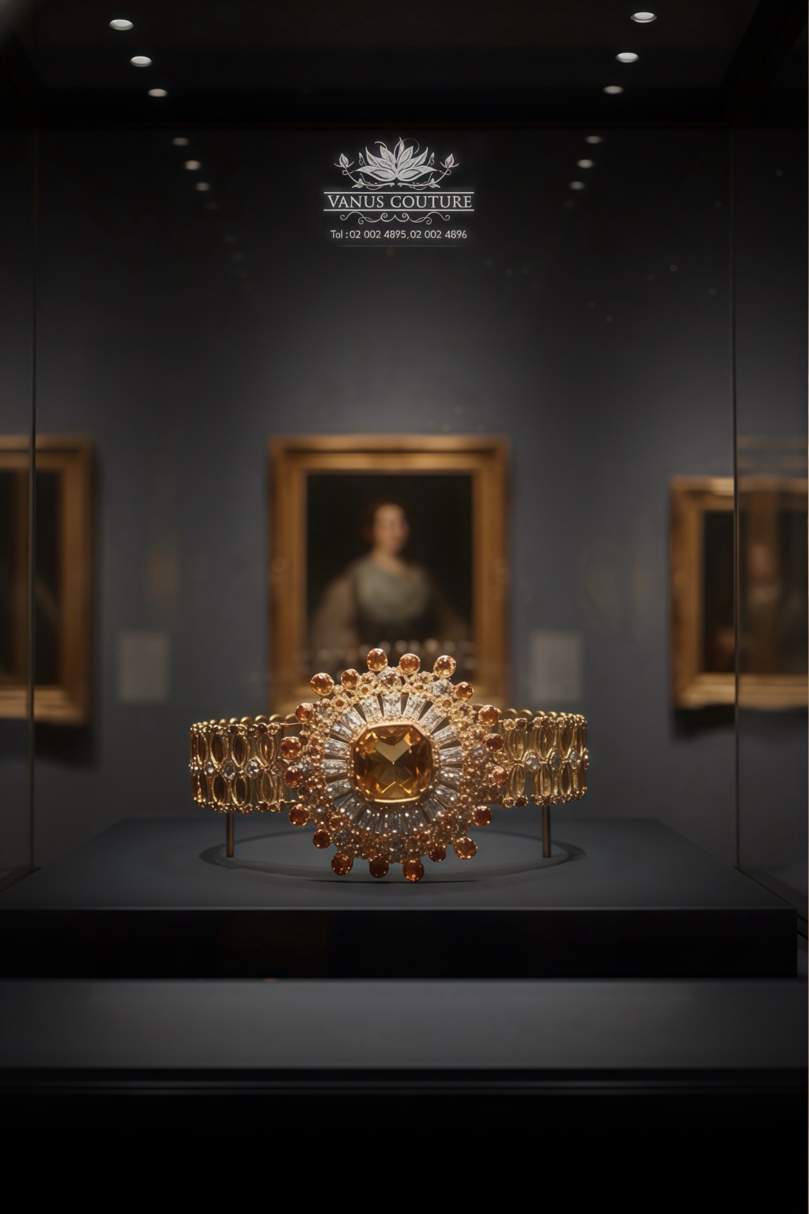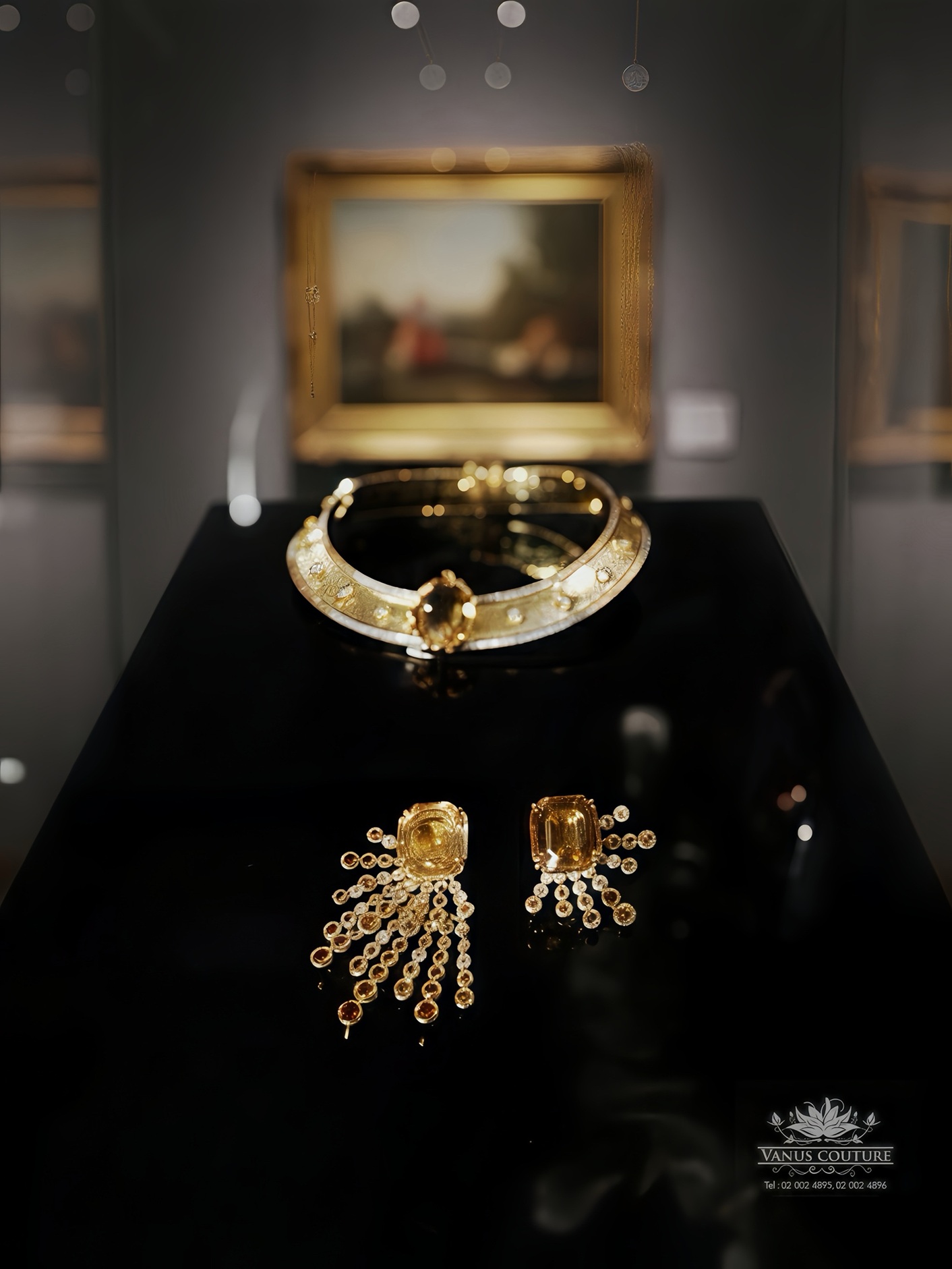ประดับคอโครงสร้างแข็งและพลอยบุษราคัมน้ำทองทรงเหลี่ยมประดับเพชรที่ไล่เฉดสีเสมือนแสงแรกยามเช้า สื่อถึงความแข็งแกร่งและพลังอำนาจ โดยมีแรงบันดาลใจจากลวดลายดอกไม้ ลวดลายบนกระเบื้องของวัดอรุณ สื่อถึงความเป็นมงคล และความรุ่งเรือง