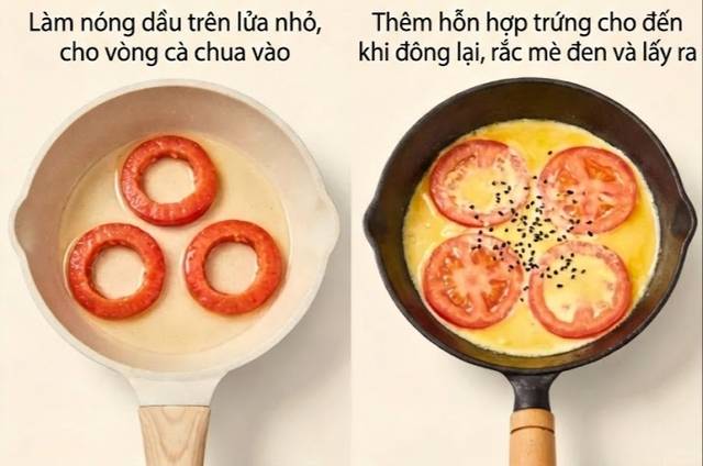 ลงกระทะ: ตั้งกระทะเทฟลอน ใช้ไฟอ่อน (ทาพิวน้ำมันบางๆ หรือไม่ใส่เลยก็ได้) วางวงกลมมะเขือเทศที่เตรียมไว้ลงไป จากนั้นค่อยๆ หยอดส่วนผสมไข่ลงตรงกลางวงมะเขือเทศ