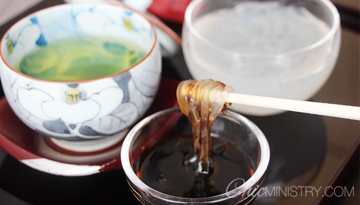 นอกจากของคาวแล้ว ห้องอาหาร Yamazato ยังได้เสิร์ฟของหวานเป็นเส้นใสๆคล้ายลอดช่องสิงคโปร์ครับ พอคีบขึ้นมาหลังจากนั้นจิ้มกับน้ำเชื่อมที่ทำจากน้ำตาลทรายแดงหอมมากๆครับ