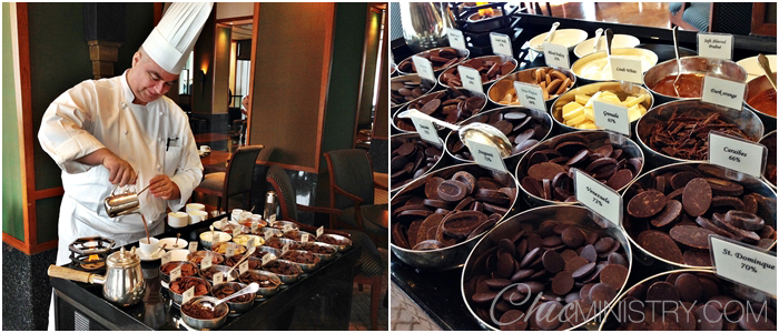 และแล้วก็มาถึงไฮไลท์ของช็อกโกแลตบุฟเฟ่ต์ ถ้าไม่ได้ทาน “Hot Chocolate” จากฝีมือของเชฟโลรองต์ ก็องกิเยต์ ผู้นี้ ก็ถือว่ามาไม่ถึงค่ะ เพราะนอกจากเชฟโลรองต์จะแสดงฝีมือทำขนมแสนอร่อยที่กล่าวมาข้างต้นให้เราได้ทานกันแล้ว เชฟยังเชี่ยวชาญในเรื่องของช็อกโกแลตจากทั่วโลกที่มีความแตกต่างทั้งรสชาติและแหล่งที่มาไม่ว่าจะช็อกโกแลตรสหวานกลมกล่อม เข้มดุดันแบบ cocoa 100% หรือรสเครื่องเทศแปลกๆ ก็มีให้เลือกทานกัน หากชอบทานรสชาติแบบไหนเชฟโลรองต์สามารถแนะนำได้ค่ะ วิธีการทำก็คือ เชฟจะนำนมสดใส่กาตั้งไฟไว้ จากนั้นใส่ช็อกโกแลตที่เราเลือกลงไป ต้มให้ละลายเข้ากันดีจึงเทใส่แก้ว ปิดท้ายด้วยวิปปิงครีมด้านบน ก็พร้อมเสิร์ฟแล้วค่ะ ...ว่าแล้วขอสั่งมาดื่มสักแก้วดีกว่า