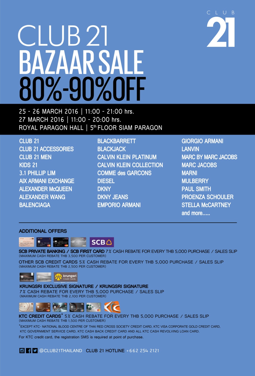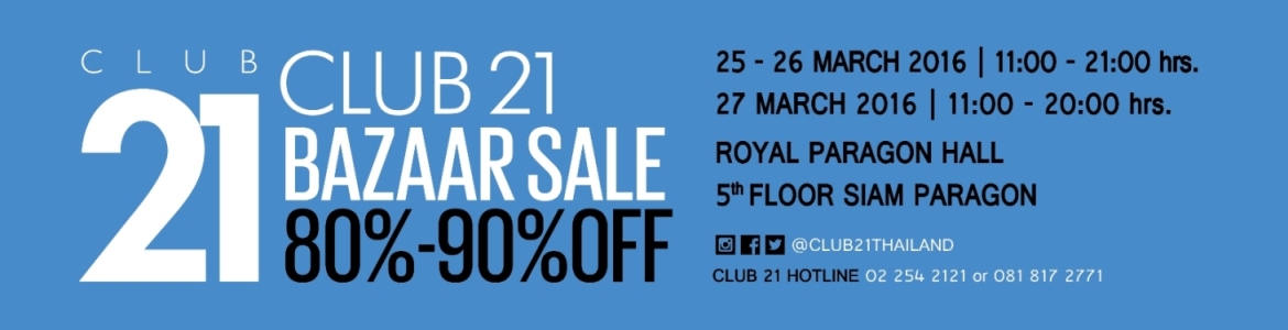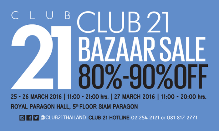บริษัท คลับ 21 ประเทศไทย จำกัด เป็นบริษัทนำเข้าและจัดจำหน่ายเสื้อผ้า-เครื่องประดับ ซึ่งเป็นแบรนด์แฟชั่นระดับโลก จัดงาน “Club 21 Bazaar Sale 2016” ลดราคาสินค้าแบรนด์เนม 80-90% ทั้งเสื้อผ้าสุภาพบุรุษ สุภาพสตรี และเสื้อผ้าเด็ก รวมถึง เครื่องประดับ กระเป๋า รองเท้า และอื่นๆ อีกมากมายกับหลากหลายแบรนด์ดังจากทั่วทุกมุมโลก อาทิเช่น