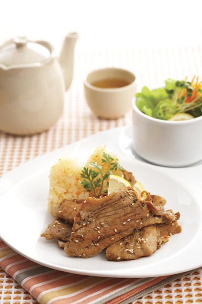 ทุบเนื้อหมูด้วยฆ้อนทุบเนื้อเบา ๆ ใส่งาขาวคั่ว พริกไทยดำ รากผักชี ซีอิ๊วขาว ซอสปรุงรส น้ำตาลทราย น้ำเปล่า น้ำมันมะกอก คลุกเคล้าให้เข้ากัน หมักทิ้งไว้ 30 นาที นำไปย่างบนกระทะให้เหลือง จัดใส่จานเสิร์ฟคู่กับข้าวเหนียวและผักสลัดตามชอบ